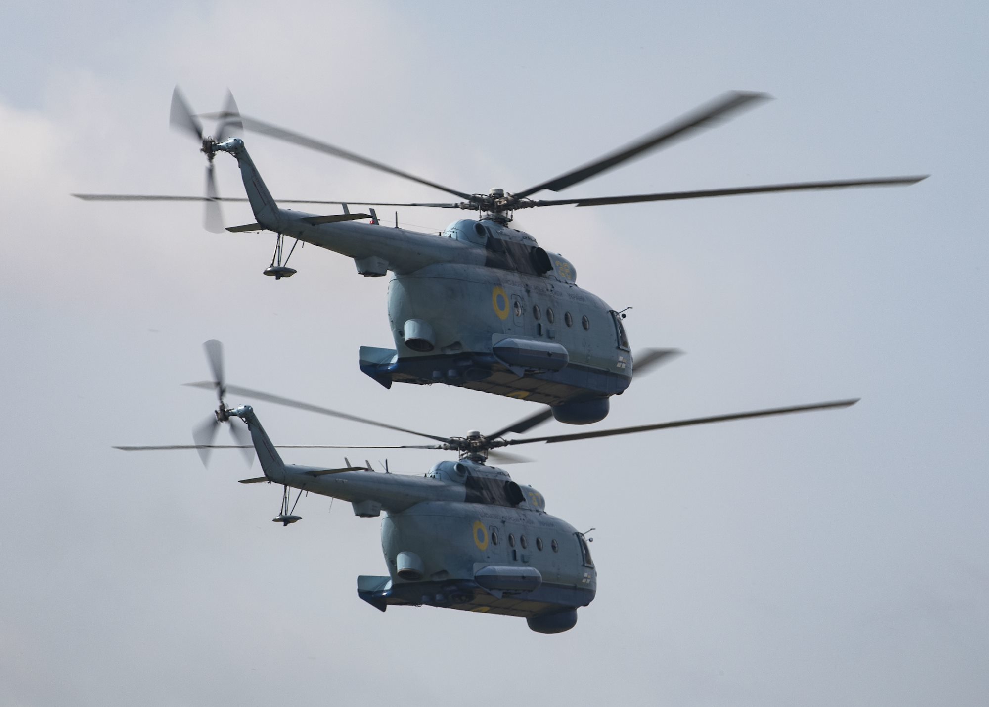 210630-N-BM428-0247 MYKOLAIV MILITARY AIRBASE, Ukraine (June 30, 2021) Two Ukrainian Mi-8 helicopters fly in formation during an air demonstration portion of Exercise Sea Breeze 2021 on Mykolaiv Military Airbase, Ukraine, June 30, 2021. Exercise Sea Breeze is a multinational maritime exercise cohosted by the U.S. Sixth Fleet and the Ukrainian Navy since 1997. Sea Breeze 2021 is designed to enhance interoperability of participating nations and strengthens maritime security and peace in the region. (U.S. Navy photo by Mass Communications Specialist 2nd Class Damon Grosvenor/Released)