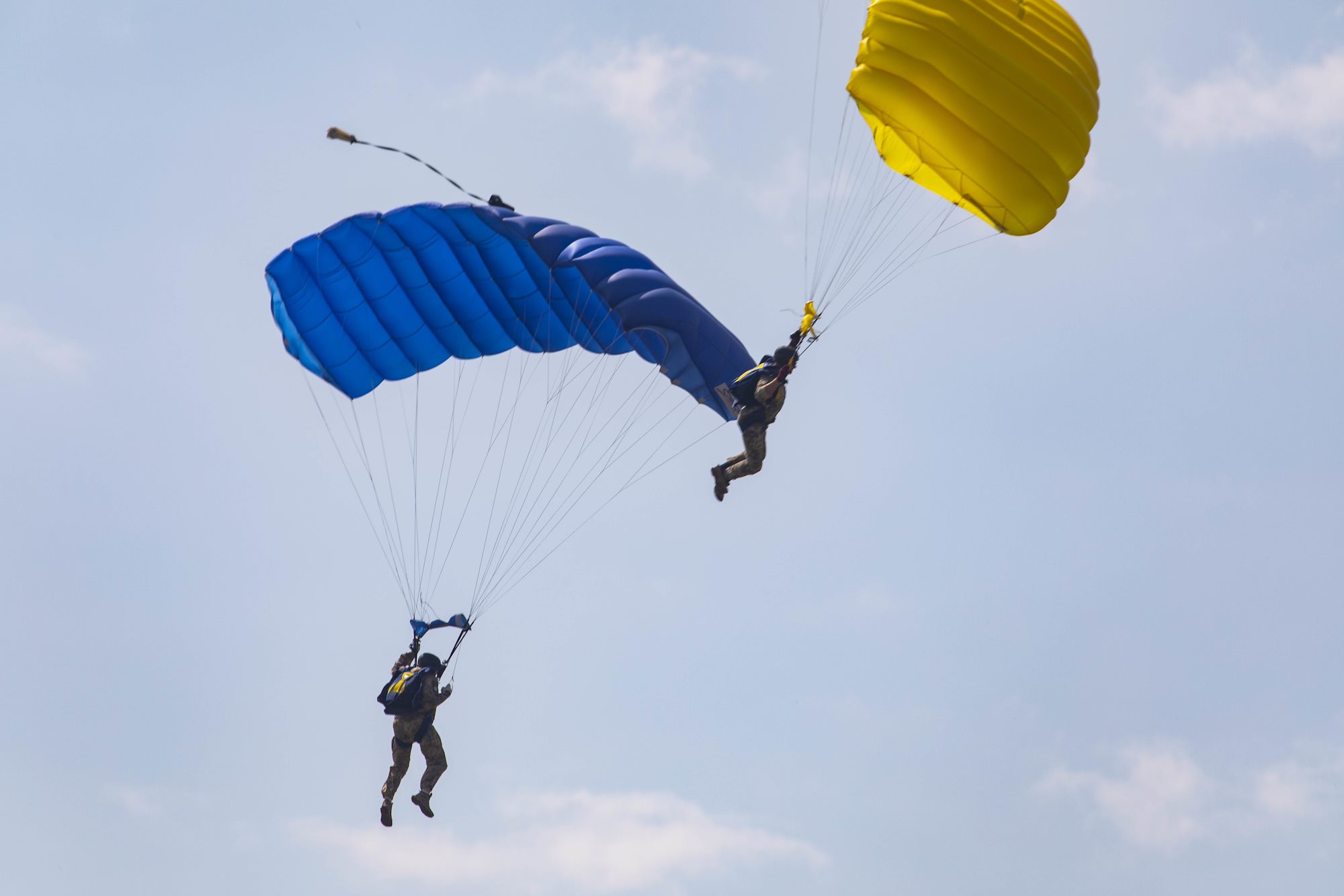 210630-N-BM428-0543 MYKOLAIV MILITARY AIRBASE, Ukraine (June 30, 2021) A pair Ukrainian paratroopers prepare to land after conducting an airborne jump during an Exercise Sea Breeze air demonstration on Mykolaiv Military Airbase, Ukraine, June 30, 2021. Exercise Sea Breeze is a multinational maritime exercise cohosted by the U.S. Sixth Fleet and the Ukrainian Navy since 1997. Sea Breeze 2021 is designed to enhance interoperability of participating nations and strengthens maritime security and peace in the region. (U.S. Navy photo by Mass Communications Specialist 2nd Class Damon Grosvenor/Released)