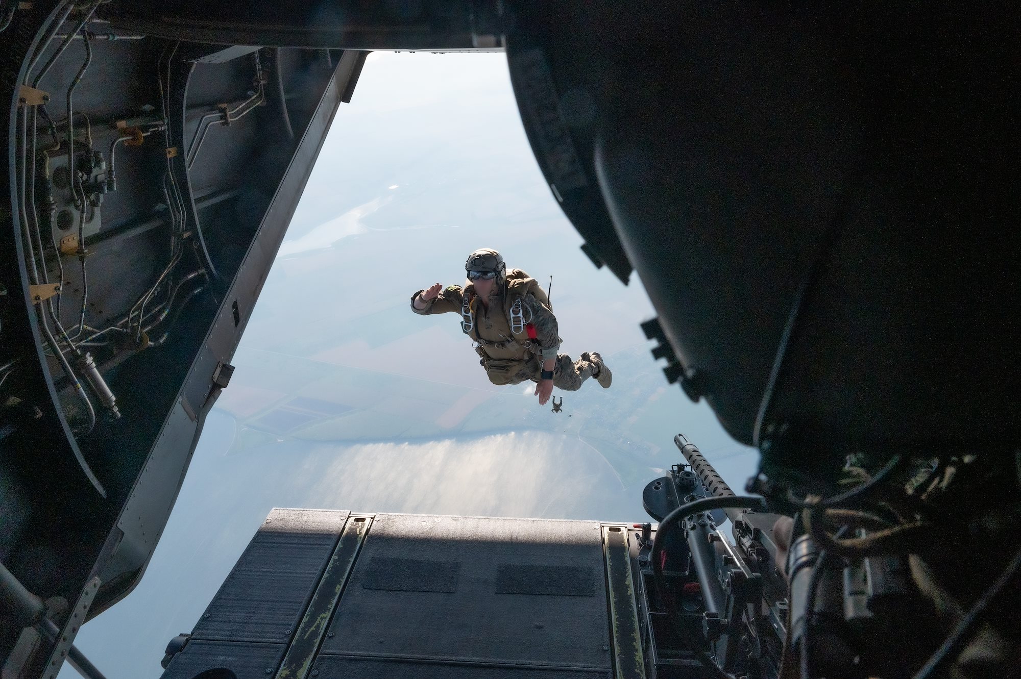 A U.S. Navy Special Warfare Operator salutes as he jumps out a U.S. Air Force CV-22B assigned to the 352d Special Operations Wing, during a military free fall training during exercise Sea Breeze 21 at Ochakiv, Ukraine, June 26, 2021. This is the 21st iteration of exercise Sea Breeze which is an annual Ukraine and U.S. co-hosted multinational maritime exercise held in the Black Sea region and is designed to enhance interoperability of participating nations, strengthening maritime security in support of stability within the region. (U.S. Air Force photo by Army Staff Sgt. Brandon Nelson)