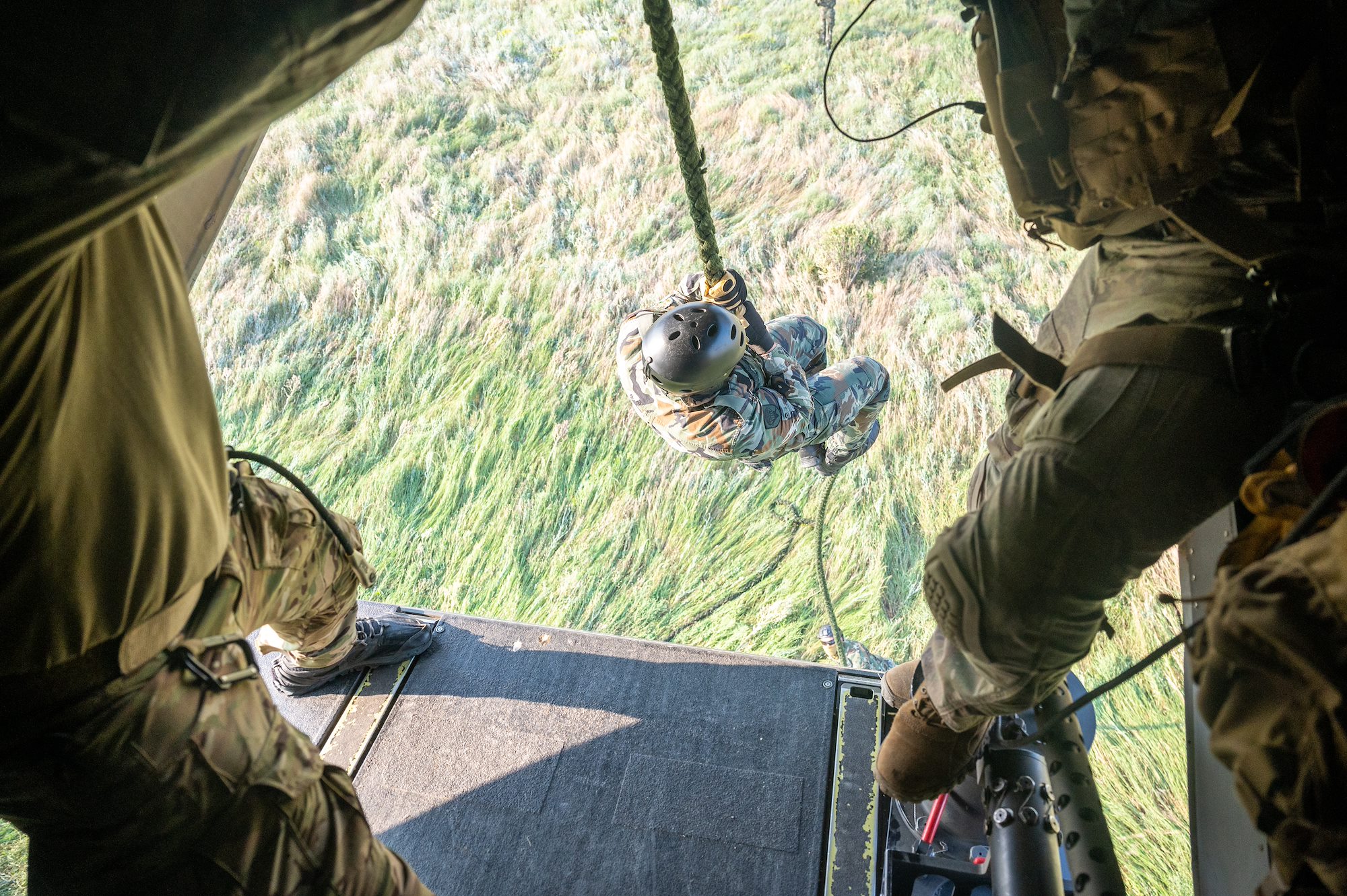 A Bulgarian Special Operations Forces operator repels from a U.S. Air Force CV-22B Osprey assigned to the 352d Special Operations WIng during a fast-rope insertion and extraction training during exercise Sea Breeze 21 at Ochakiv, Ukraine, June 29, 2021. This is the 21st iteration of the exercise which is an annual Ukraine and U.S. co-hosted multinational maritime exercise held in the Black Sea region and is designed to enhance interoperability of participating nations, strengthening maritime security in support of stability within the region. (U.S. Air Force photo by Army Staff Sgt. Brandon Nelson)