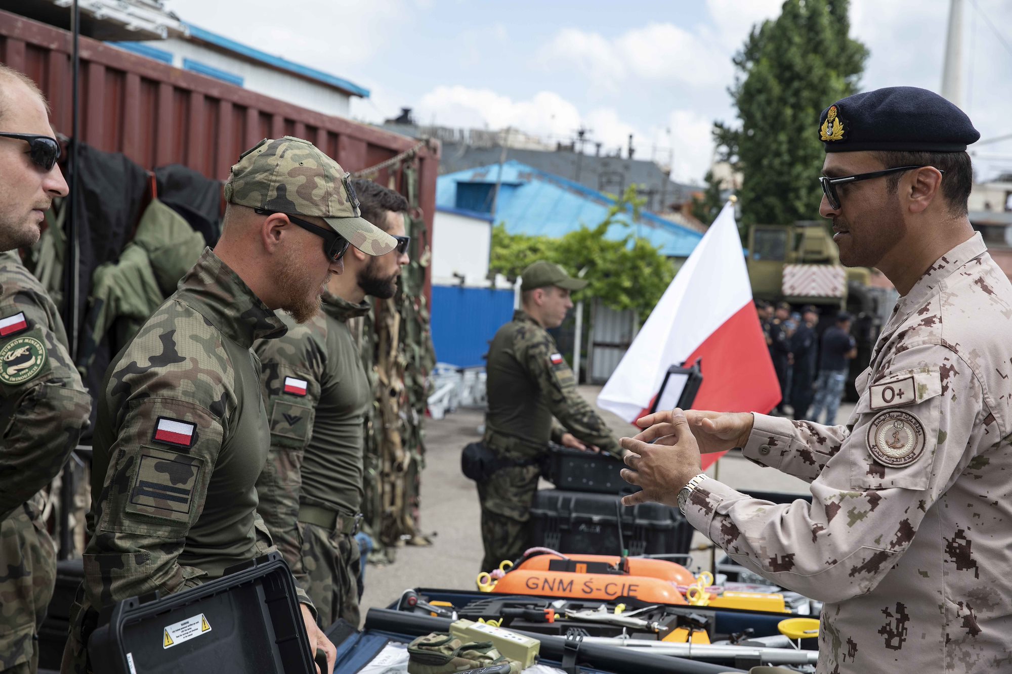210706-N-BM428-0221 ODESA, Ukraine (July 6, 2021) An Egyptian military officer speaks with Polish navy sailors about their diving equipment during Exercise Sea Breeze 2021 in Odesa, Ukraine, July 6, 2021. Exercise Sea Breeze is a multinational maritime exercise cohosted by the U.S. Sixth Fleet and the Ukrainian Navy since 1997. Sea Breeze 2021 is designed to enhance interoperability of participating nations and strengthens maritime security and peace in the region. (U.S. Navy photo by Mass Communications Specialist 2nd Class Damon Grosvenor/Released)