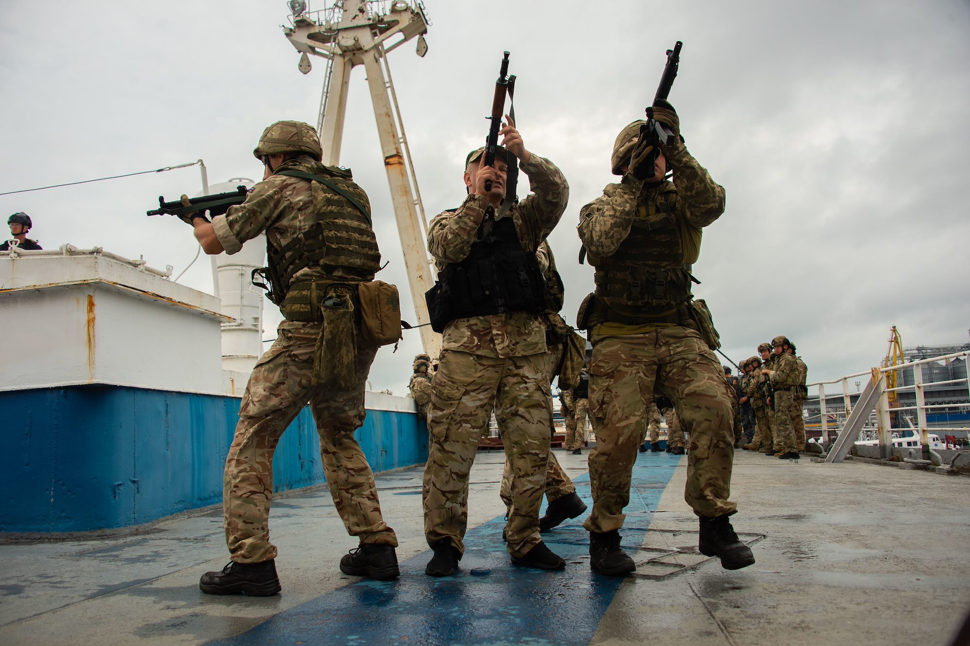 210705-F-D0094-404 ODESA, Ukraine (July 5, 2021) Multinational partners train with members of the Naval Tactical Operations Group on ship drills during Exercise SEA BREEZE 21 in Odesa, Ukraine on July 5, 2021. Co-hosted by the United States Navy (USN) and the Ukrainian Navy (UN) with the support of NATO’s Partnership for Peace program, Exercise SEA BREEZE is about training together and making new friends based on a shared commitment to peace and stability in Europe. The deployment of CAF personnel to support Exercise SEA BREEZE 21 is part of Operation UNIFIER, the CAF military training and capacity-building mission in Ukraine. (CAF photo by Corporal Daniel Chiasson, JTF-U Imagery Technician)