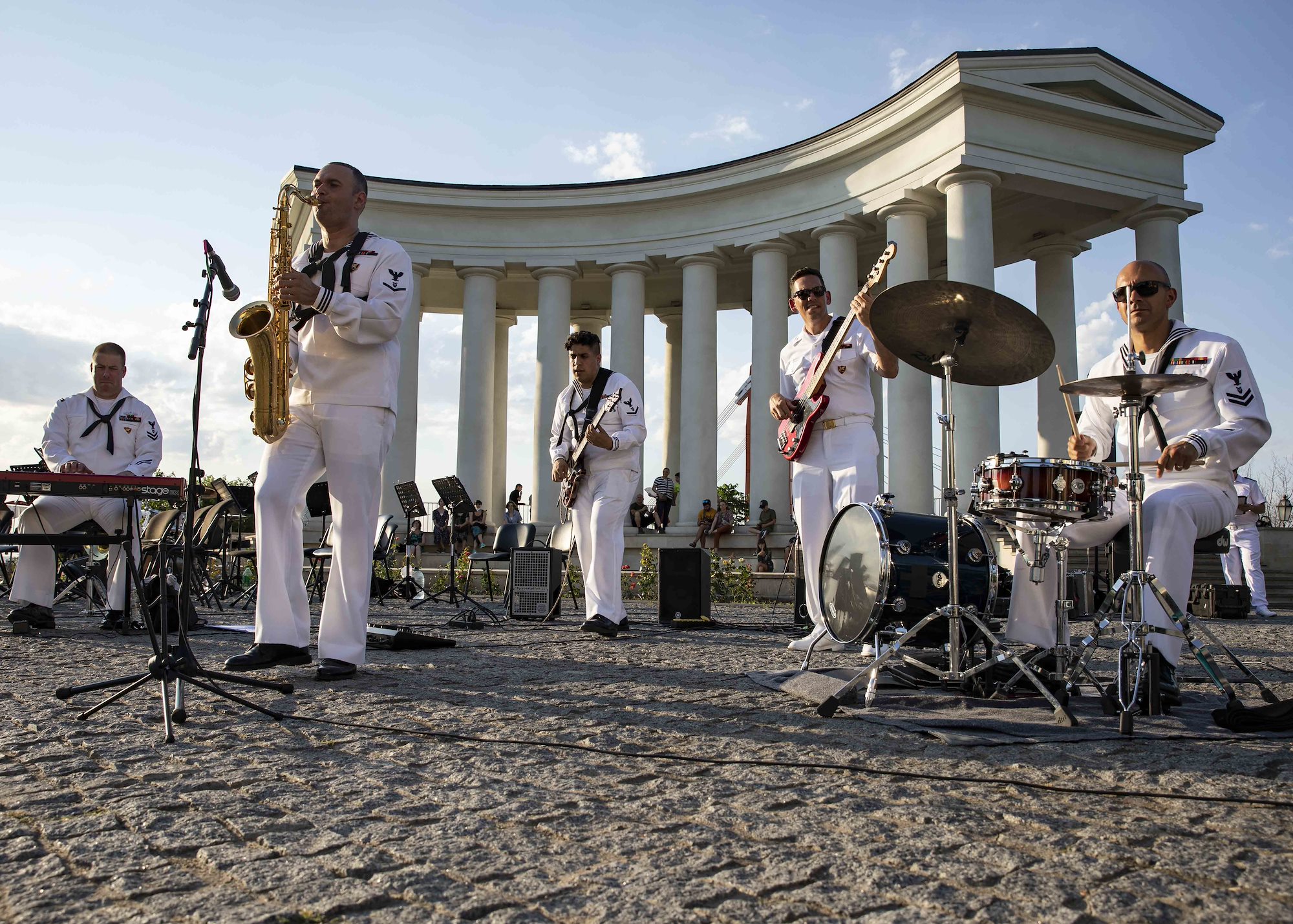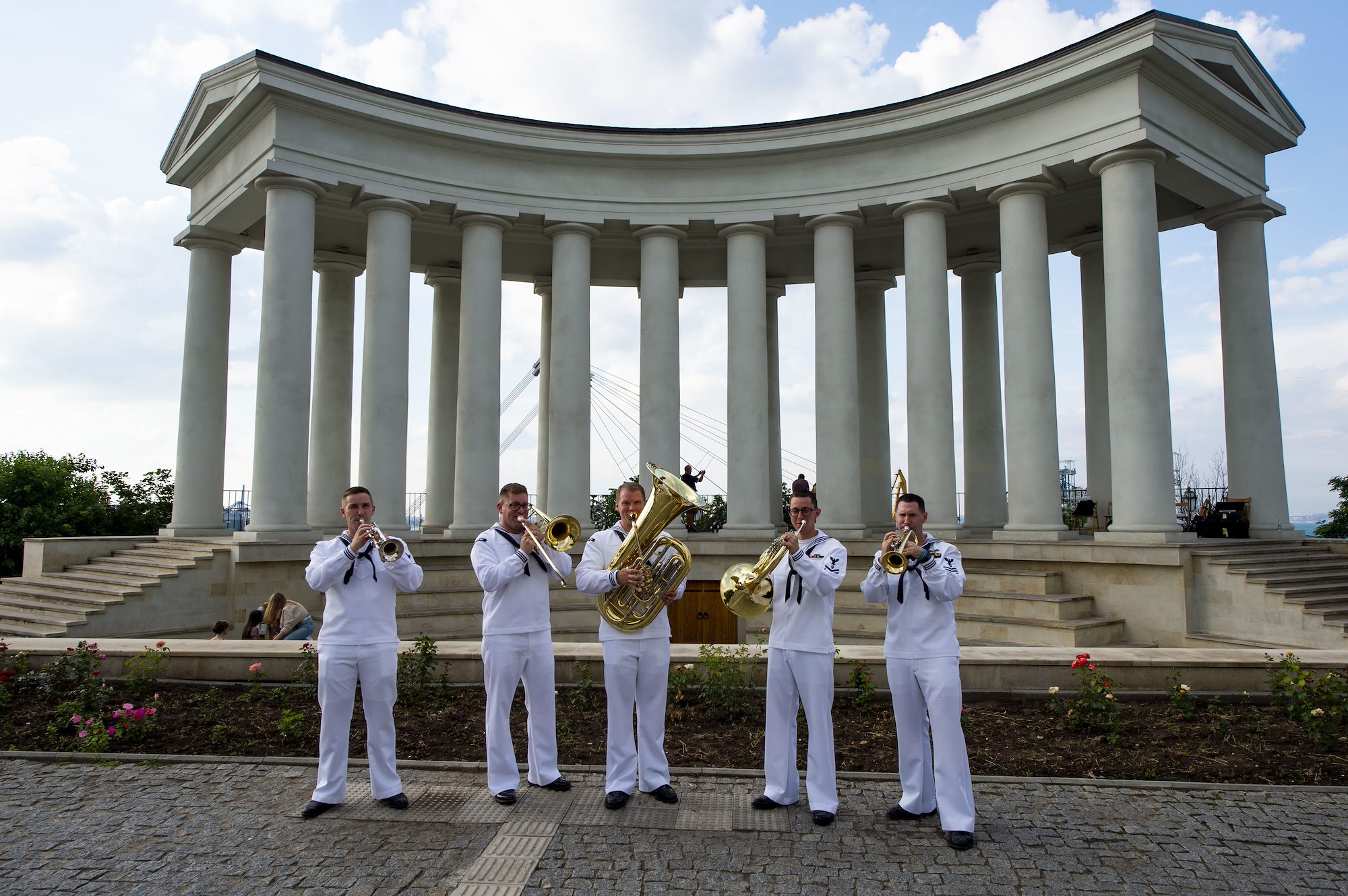 210708-N-BM428-0029 ODESA, Ukraine (July 8, 2021) The U.S. Naval Forces Europe and Africa Band plays music in front of the Vorontsov Colonnade in Odesa, Ukraine during Exercise Sea Breeze 2021, July 8, 2021. Exercise Sea Breeze is a multinational maritime exercise cohosted by the U.S. Sixth Fleet and the Ukrainian Navy since 1997. Sea Breeze 2021 is designed to enhance interoperability of participating nations and strengthens maritime security and peace in the region. (U.S. Navy photo by Mass Communications Specialist 2nd Class Damon Grosvenor/Released)