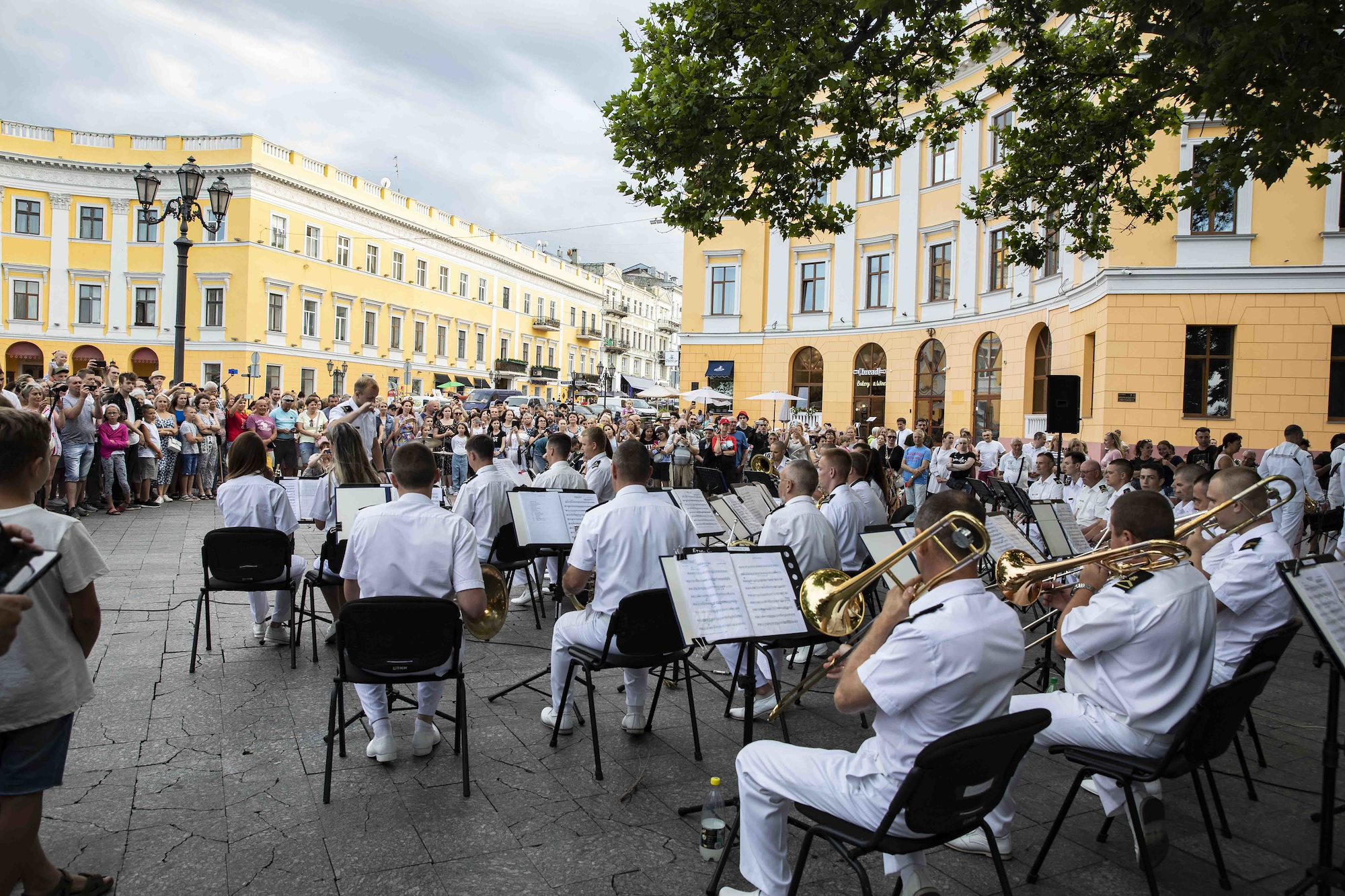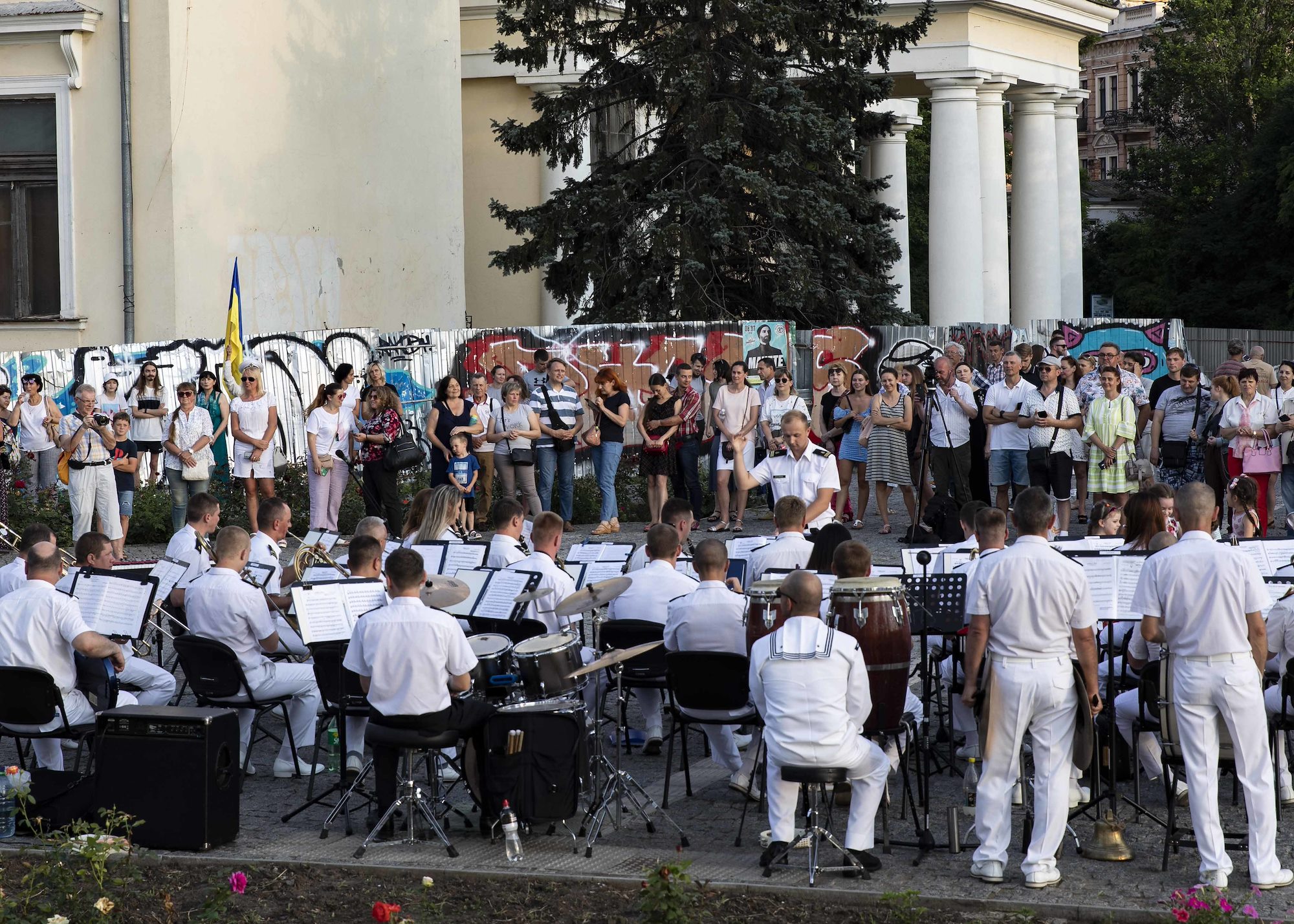 210708-N-BM428-0087 ODESA, Ukraine (July 8, 2021) The Ukrainian Navy Band plays music in front of the Vorontsov Colonnade in Odesa, Ukraine during Exercise Sea Breeze 2021, July 8, 2021. Exercise Sea Breeze is a multinational maritime exercise cohosted by the U.S. Sixth Fleet and the Ukrainian Navy since 1997. Sea Breeze 2021 is designed to enhance interoperability of participating nations and strengthens maritime security and peace in the region. (U.S. Navy photo by Mass Communications Specialist 2nd Class Damon Grosvenor/Released)