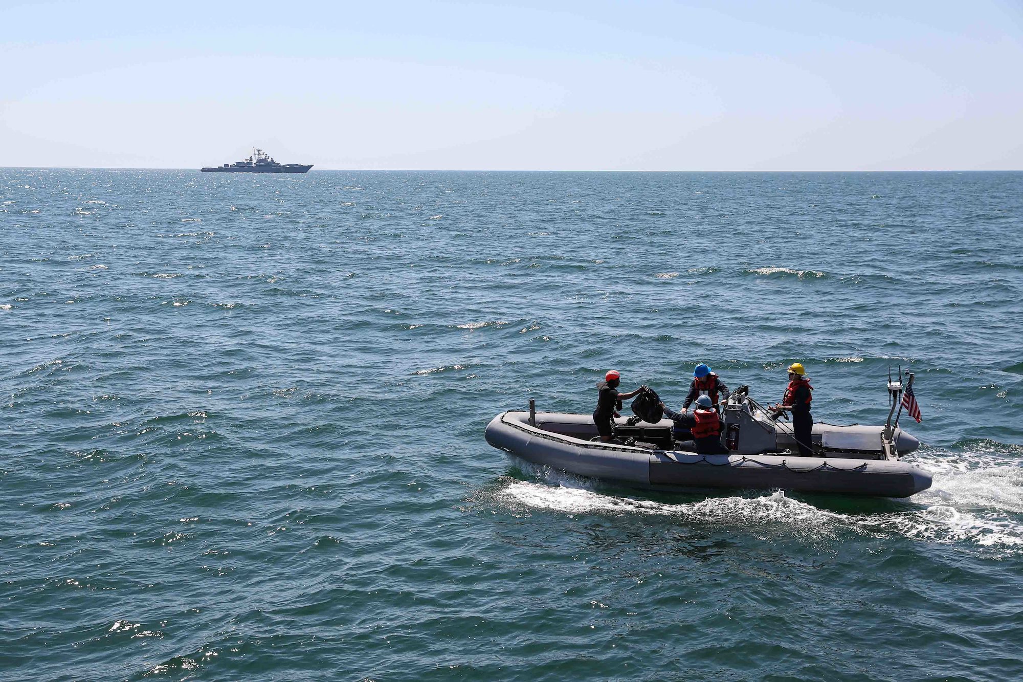 BLACK SEA (July 9, 2021) Sailors assigned to the Arleigh Burke-class guided-missile destroyer USS Ross (DDG 71) prepare to transfer passengers between ships using a rigid-hull inflatable boat during Exercise Sea Breeze in the Black Sea, July 9, 2021. Exercise Sea Breeze is a multinational maritime exercise cohosted by U.S. Sixth Fleet and the Ukrainian Navy in the Black Sea since 1997. Sea Breeze 2021 is designed to enhance interoperability of participating nations and strengthen maritime security and peace within the region. (U.S. Navy photo by Mass Communication Specialist 2nd Class Claire DuBois/Released)