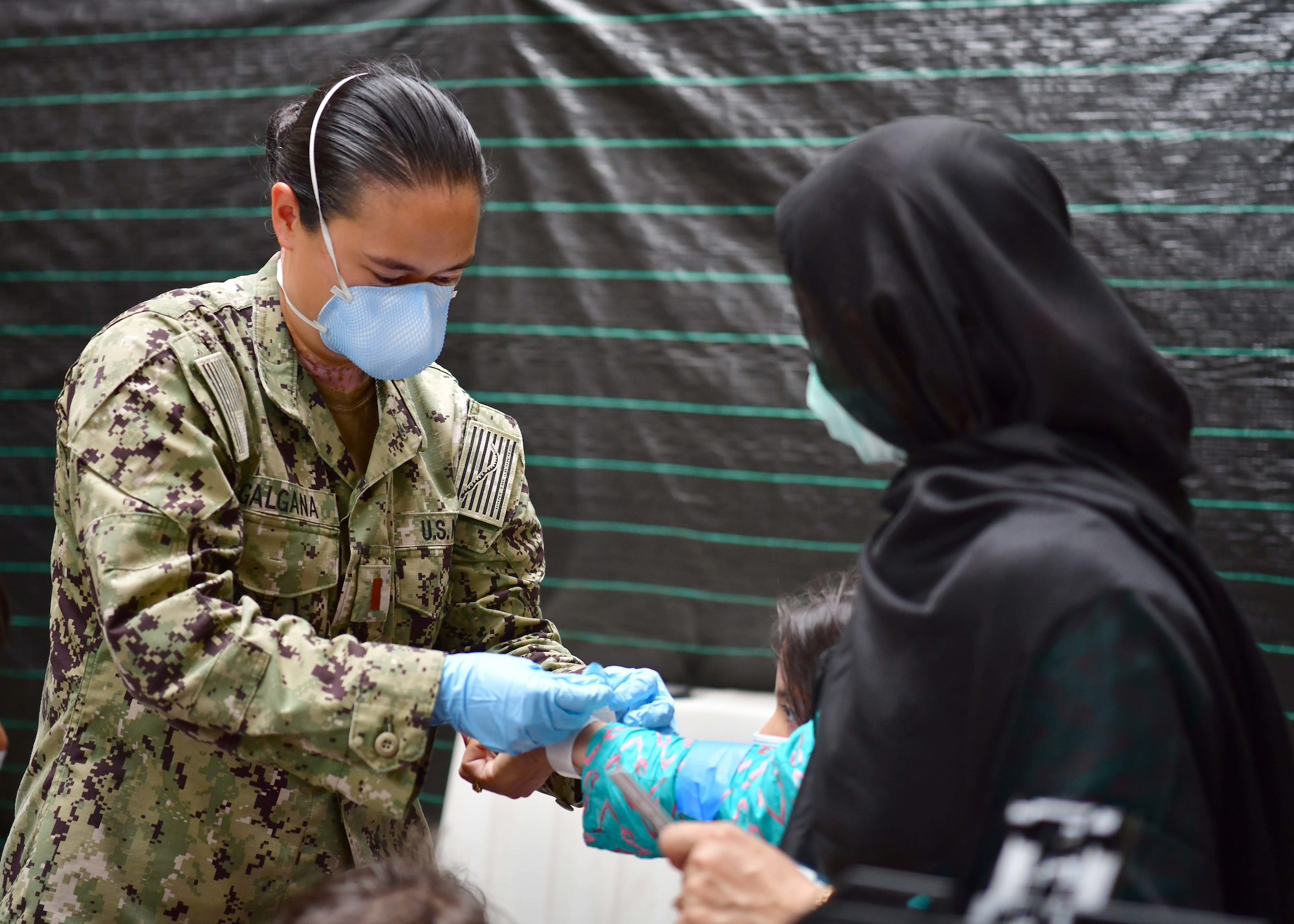 Ens. Galgana assists an Afghan evacuee aboard Naval Air Station Sigonella, Aug. 22, 2021. NAS Sigonella is currently supporting the Department of Defense mission to facilitate the safe departure and relocation of U.S. citizens, Special Immigration Visa recipients, and vulnerable Afghan populations from Afghanistan.