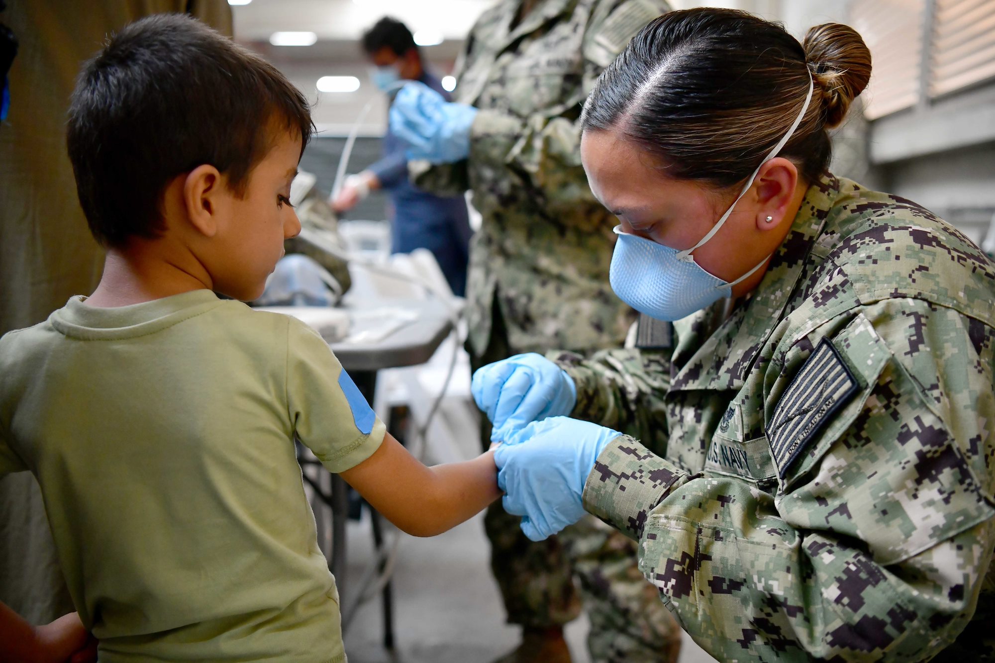 A U.S. Navy Sailor assists an Afghan evacuee aboard Naval Air Station Sigonella, Aug. 22, 2021. NAS Sigonella is currently supporting the Department of Defense mission to facilitate the safe departure and relocation of U.S. citizens, Special Immigration Visa recipients, and vulnerable Afghan populations from Afghanistan.