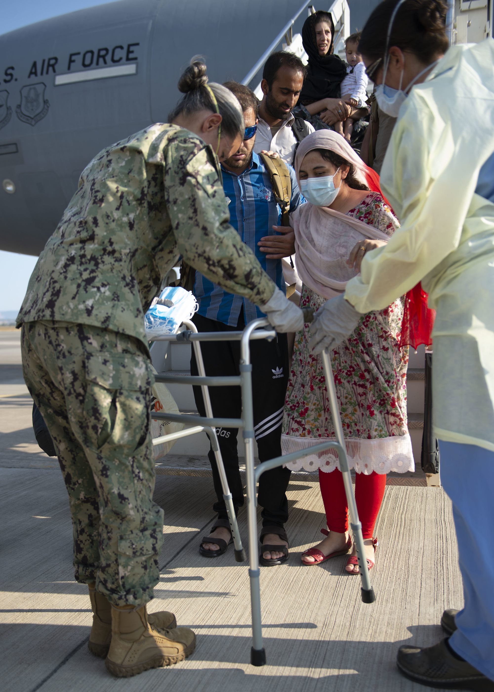 210822-N-OX321-1412 NAVAL AIR STATION SIGONELLA, Italy (Aug. 22, 2021) Naval Air Station Sigonella Command Master Chief Anna Wood assists an evacuee disembarking a U.S. Air Force KC-10 Extender Aug. 22, 2021. NAS Sigonella is currently supporting the Department of Defense mission to facilitate the safe departure and relocation of U.S. citizens, Special Immigration Visa recipients, and vulnerable Afghan populations from Afghanistan.