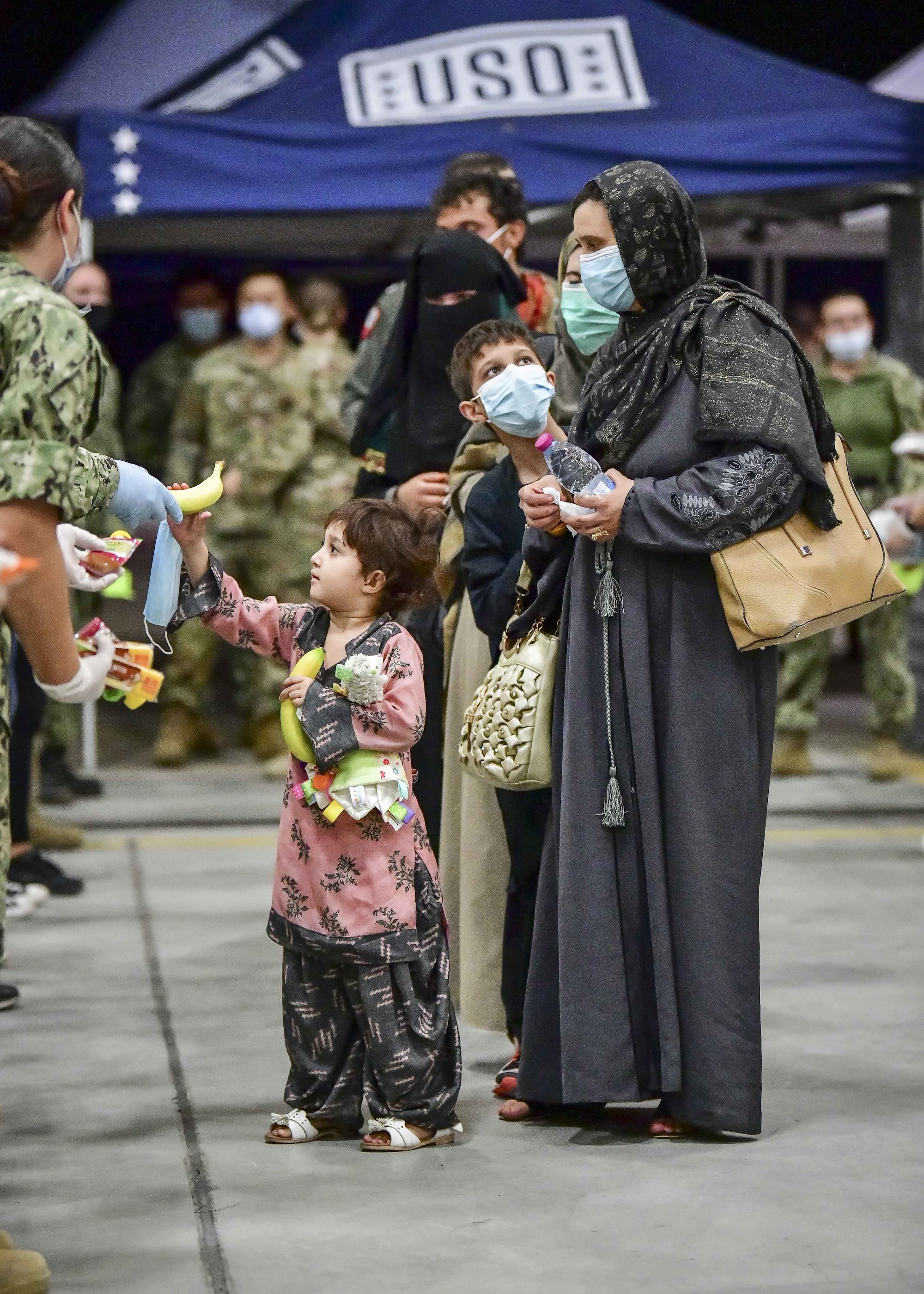 A family of Afghan evacuees receive food and masks at Naval Air Station Sigonella, Aug. 22, 2021. NAS Sigonella is currently supporting the Department of Defense mission to facilitate the safe departure and relocation of U.S. citizens, Special Immigration Visa recipients, and vulnerable Afghan populations from Afghanistan.