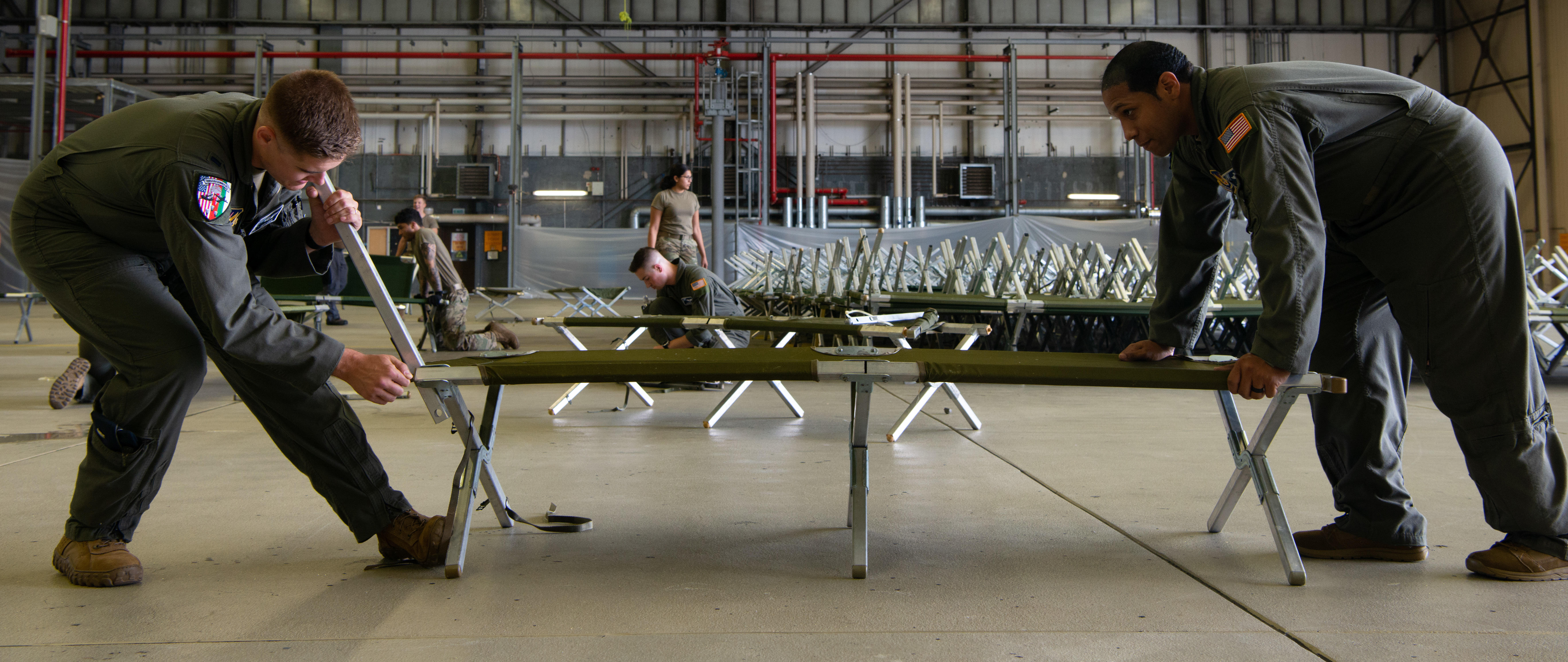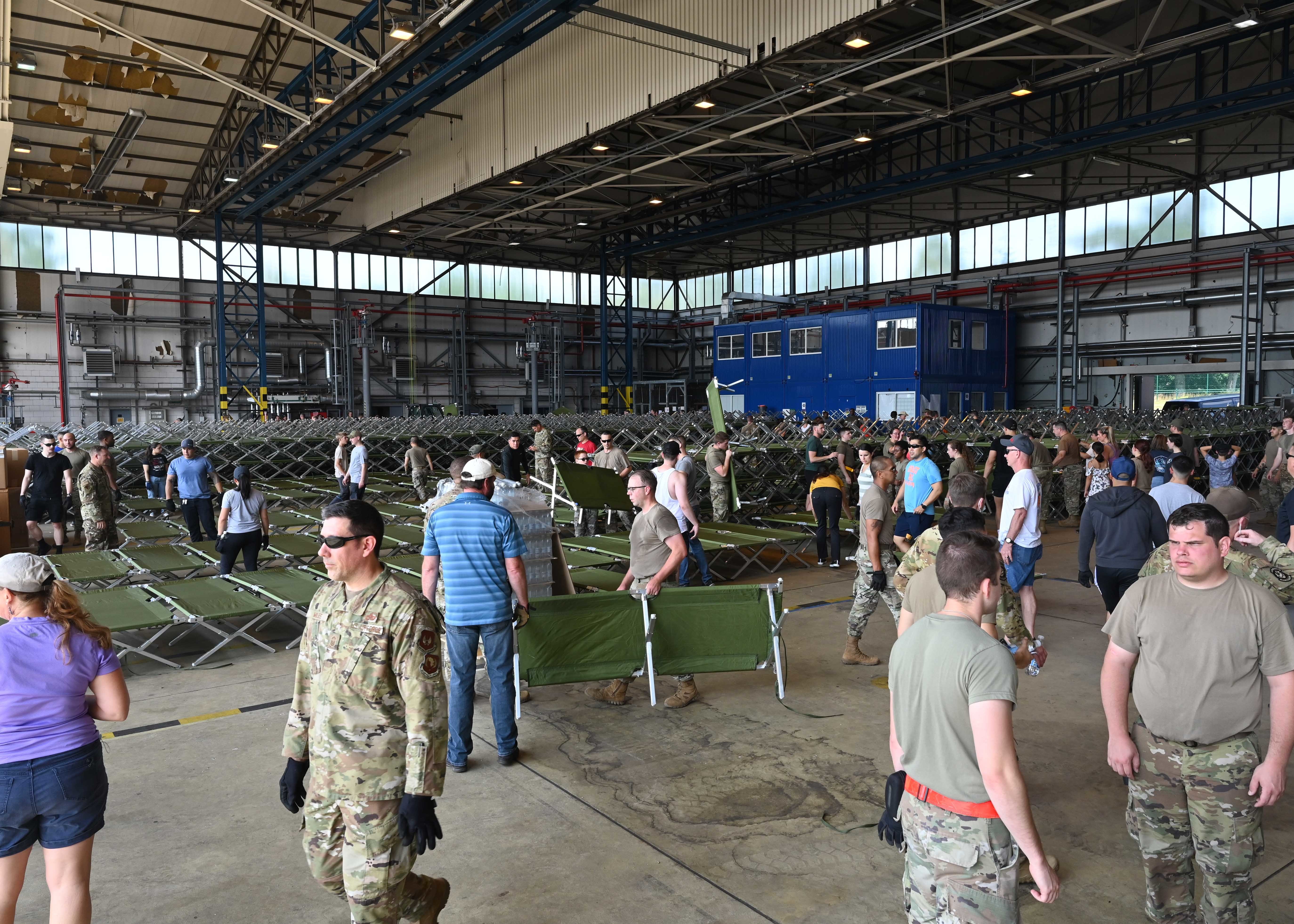 Volunteers assemble additional cots inside a hangar at Ramstein Air Base, Germany, Aug. 21, 2021. Ramstein Air Base is providing safe, temporary lodging for evacuees from Afghanistan as part of Operation Allies Refuge. This operation is facilitating the quick, safe evacuation of U.S. citizens, Special Immigrant Visa applicants, and other at-risk Afghans from Afghanistan. Evacuees will receive support, such as temporary lodging, food and water and access to medical care as well as religious care at Ramstein Air Base while preparing for onward movements to their final destinations. (U.S. Air Force photo by Senior Airman Caleb Kimmell)
