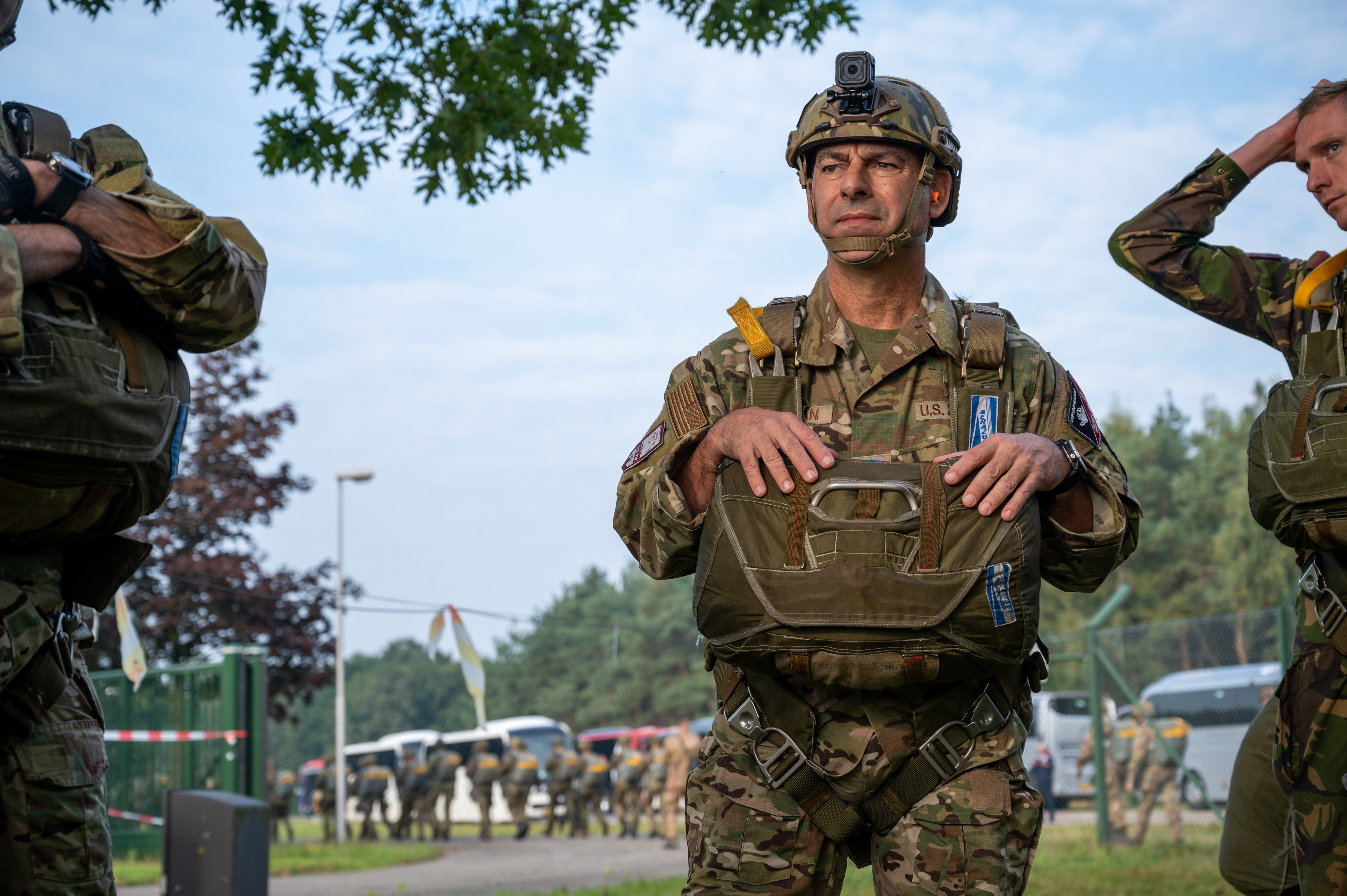 Gen. Jeff Harrigian, U.S. Air Forces in Europe – Air Forces Africa commander, is fitted for a harness and parachute as part of Falcon Leap 2021 at Eindhoven Airport, Netherlands, Sept. 17, 2021. As a multinational parachute exercise, Falcon Leap commemorates the 77th anniversary of Operation Market Garden, an Allied airborne mission during World War II, designed to capture three major bridges to reach Germany’s industrial heartland. (U.S. Air Force photo by Senior Airman Branden Rae)