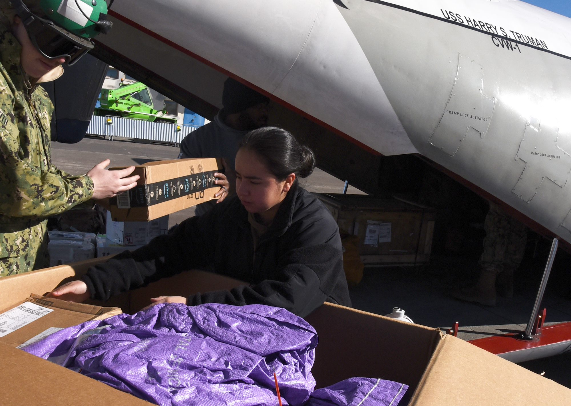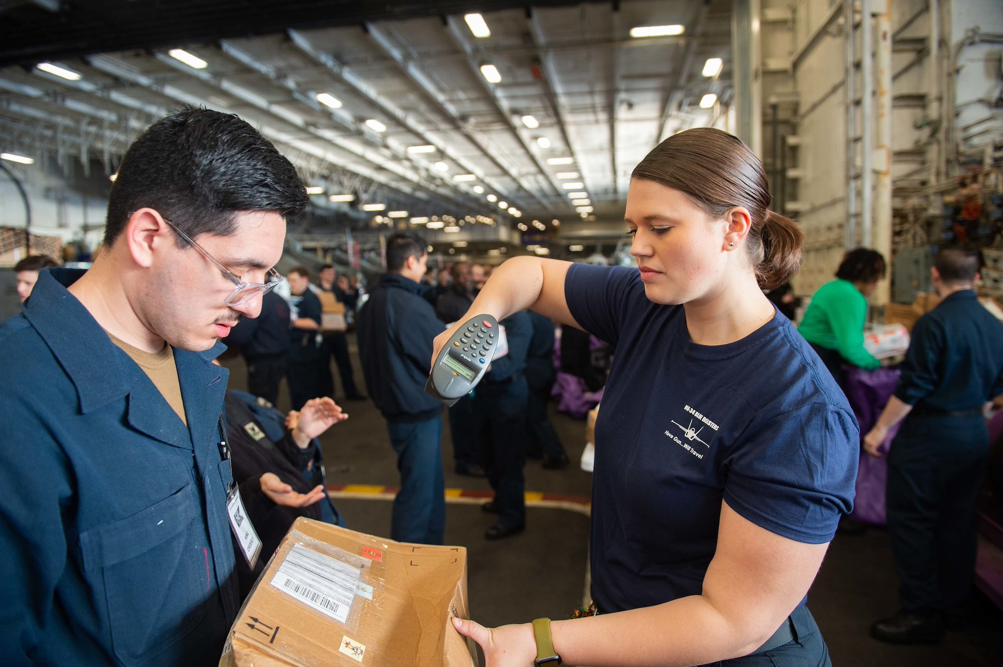 MEDITERRANEAN SEA (Dec. 18, 2021) Logistics Specialist 3rd Class Caycee Pannal, from Guyton, Georgia, scans mail in the hangar bay of the Nimitz-class aircraft carrier USS Harry S. Truman (CVN 75) during a replenishment-at-sea, Dec. 18, 2021. The Harry S. Truman Carrier Strike Group is on a scheduled deployment in the U.S. Sixth Fleet area of operations in support of naval operations to maintain maritime stability and security, and defend U.S., allied and partner interests in Europe and Africa. (U.S. Navy photo by Mass Communication 3rd Class Tate Cardinal)