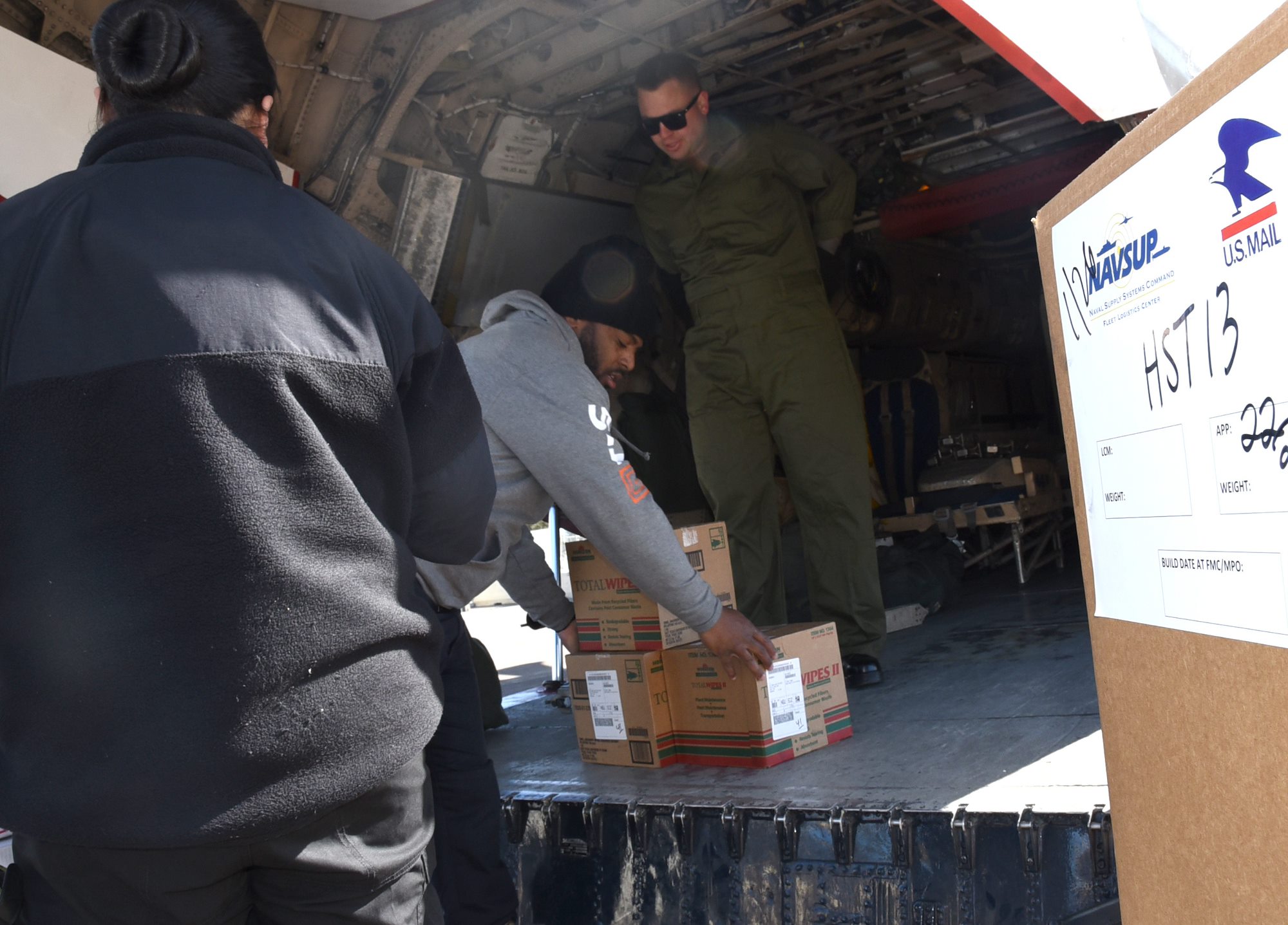 NAS SIGONELLA, Italy (Feb. 2, 2022) Naval Aircrewmen assigned to the Nimitz-class aircraft carrier USS Harry S. Truman (CVN 75) Beach Detachment 1 load mail and packages destined for HST Carrier Strike Group (HSTCSG) crewmembers. The HSTCSG participated in the NATO-led activity Neptune Strike 2022, Jan. 24-Feb. 4, 2022. (U.S. Navy photo by Joe Yanik)