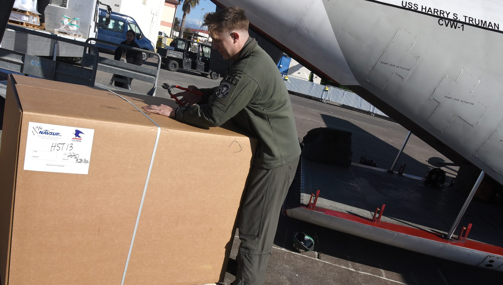 NAS SIGONELLA, Italy (Feb. 2, 2022) Naval Aircrewman Mechanical 2nd Class Timothy Pinckert, assigned to the Nimitz-class aircraft carrier USS Harry S. Truman (CVN 75) Beach Detachment 1, opens a container of mail destined for HST Carrier Strike Group (HSTCSG) crewmembers. The HSTCSG participated in the NATO-led activity Neptune Strike 2022, Jan. 24-Feb. 4, 2022. (U.S. Navy photo by Joe Yanik)