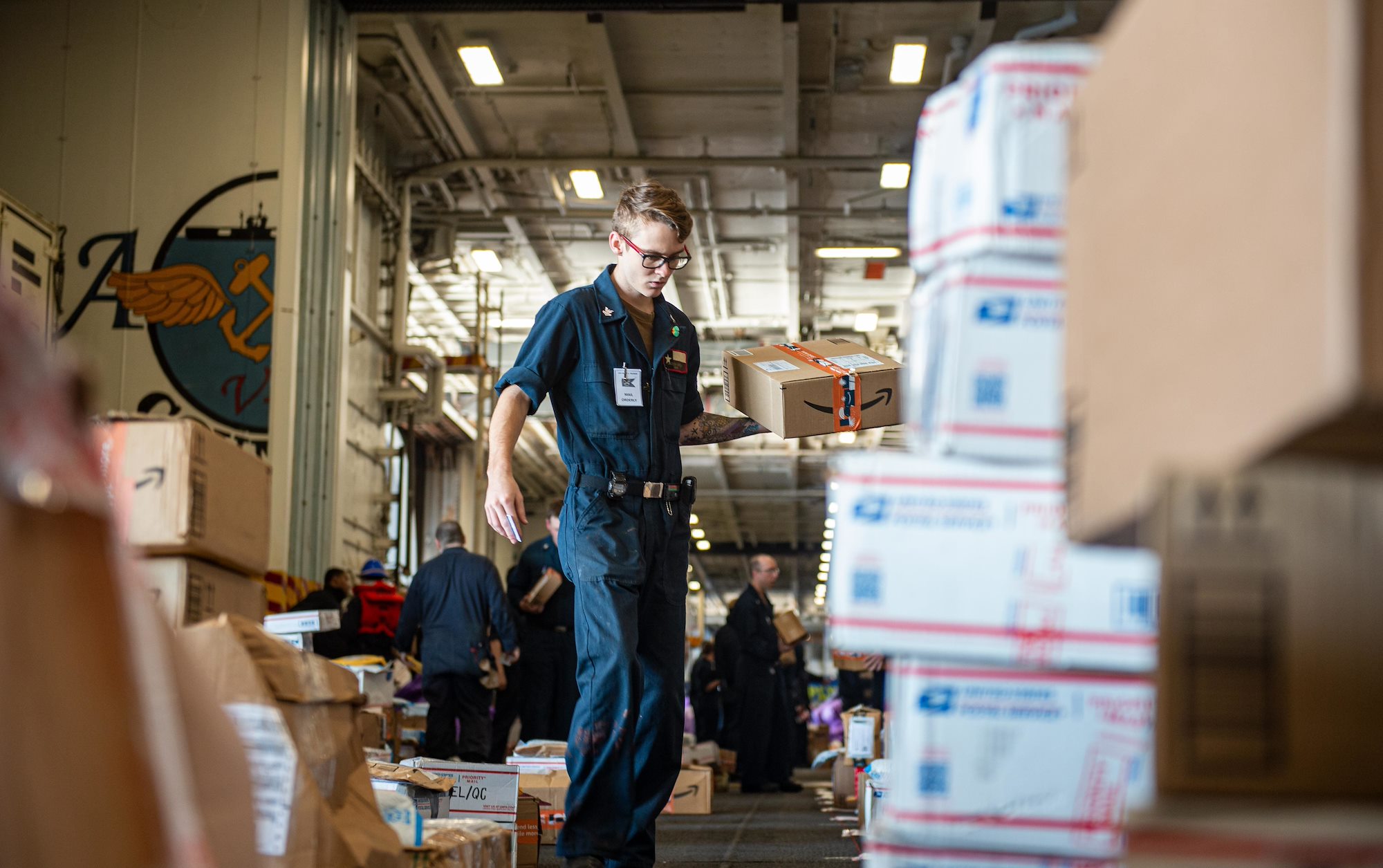 MEDITERRANEAN SEA (Dec. 18, 2021) Machinist Mate (Nuclear) 2nd Class Jackson Bowen, from Bakersfield, California, sorts mail in the hangar bay of the Nimitz-class aircraft carrier USS Harry S. Truman (CVN 75) during a replenishment-at-sea, Dec. 18, 2021. The Harry S. Truman Carrier Strike Group is on a scheduled deployment in the U.S. Sixth Fleet area of operations in support of naval operations to maintain maritime stability and security, and defend U.S., allied and partner interests in Europe and Africa. (U.S. Navy photo by Mass Communication 3rd Class Tate Cardinal)
