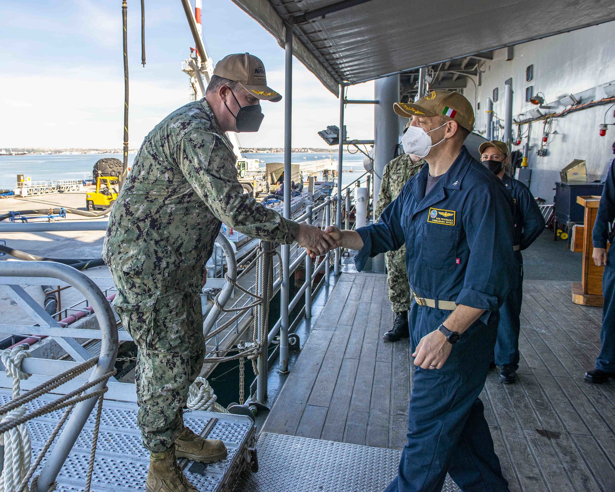 AUGUSTA BAY, Sicily (Feb. 4, 2022) Capt. Daniel Prochazka, commanding officer of the Blue Ridge-class command and control ship USS Mount Whitney (LCC 20), right, greets Capt. Douglas MacKenzie, commanding officer of NAVSUP FLC Sigonella, as the ship makes port in Augusta Bay, Sicily, Feb. 4, 2022. Neptune Strike is a long-planned activity to enable NATO to command and control a U.S. carrier strike group to provide assurance and deterrence for the collective defense for the alliance. Mount Whitney is the U.S. 6th Fleet flagship, homeported in Gaeta, and operates with a combined crew of U.S. Sailors and Military Sealift Command civil service mariners. (U.S. Navy photo by Mass Communication Specialist 2nd Class Scott Barnes)