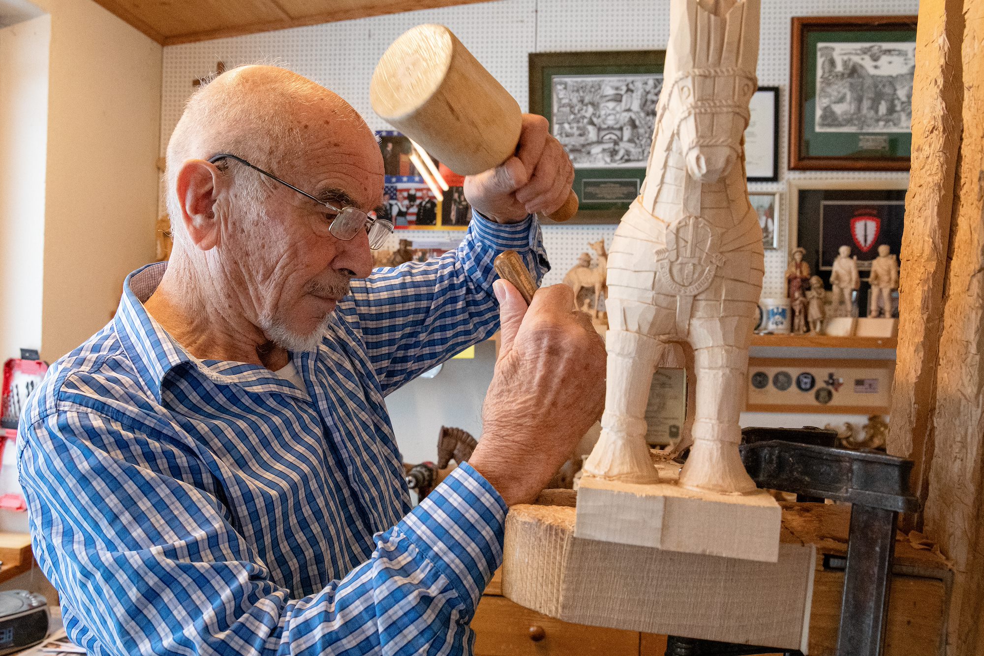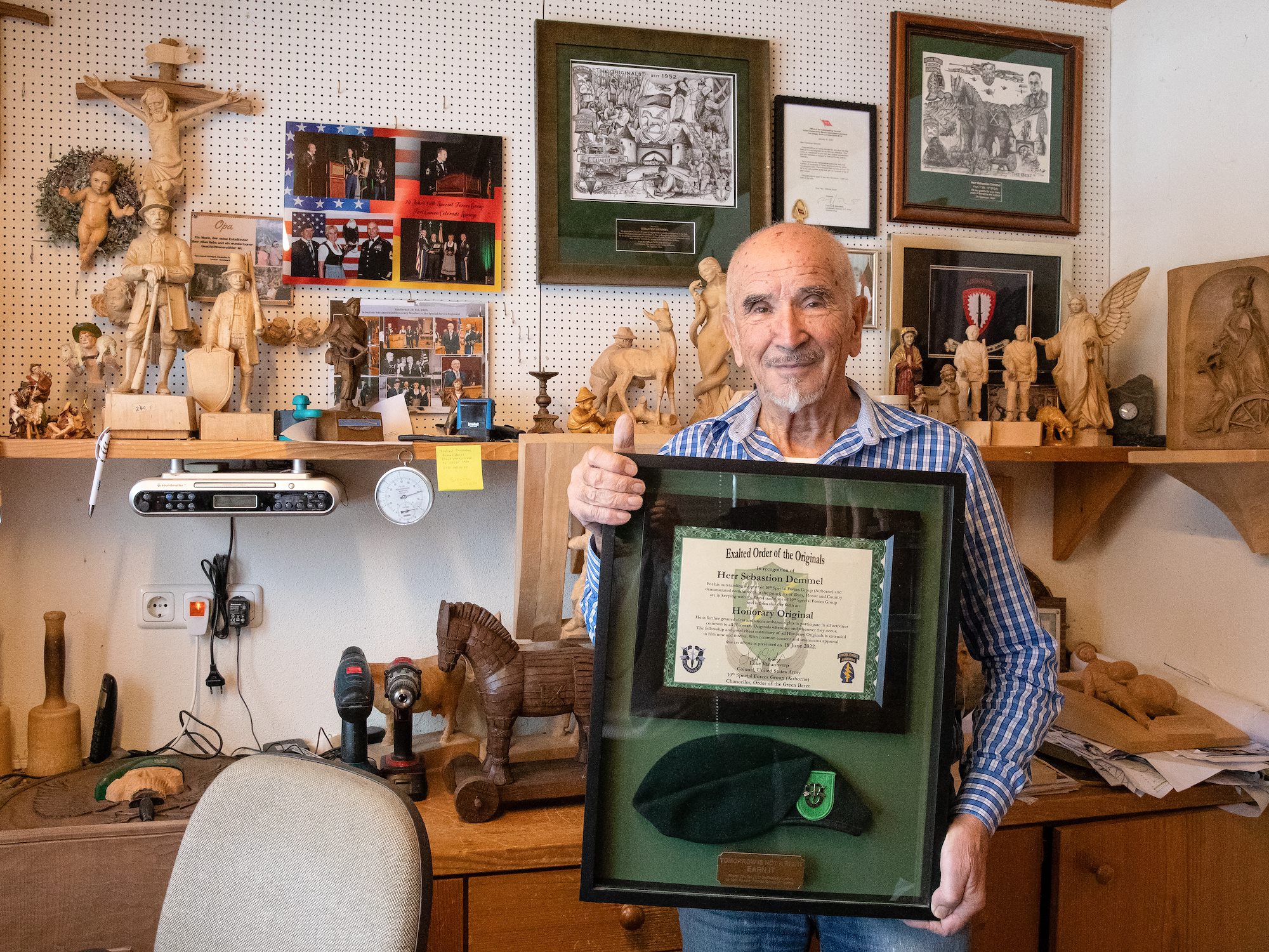 He added that bringing Demmel and his wife to Colorado for the 10th Group 70th Anniversary was an honor because of the role the couple plays in the unit’s history. Demmel’s legacy with American Soldiers goes back to when he was four years old and saw them eating at a restaurant in his village. When he turned 15, he apprenticed with a master carver, where he sanded his first Trojan horse. Demmel opened his own shop at 18 years old. A few years later, his shop caught the eye of a passing Green Beret. “They saw my window, and they came in and asked, ‘Can you make a plaque, or can you make a Special Forces Soldier?’” said Demmel. Orders started pouring in for Demmel’s hand carved creations, and they haven't slowed down, even though the 1st Battalion, 10th Special Forces Group (Airborne) moved from Bad Tölz to Stuttgart decades ago. As years have come and gone, orders have increased, as have the size of the projects he creates. Demmel now works almost exclusively for the Special Forces and other soldiers who keep him busy year-round. With over five-decades of experience under his belt, he is often asked when he is going to slow down. “First I said at 70 I’d stop, and then I said at 80 I’d stop,” said Demmel chuckling. It seems to take more effort for Demmel to carve as he ages. He now has to push more body weight onto a chisel to shape the wood. Age isn’t stopping him however, shavings continue to grace the workshop floor, and there is no sign of slowing down. This could be because his wife Christiane is setting the pace. She and Sebastian have been working in the shop together since their wedding more than 50 years ago. Christiane paints and stains pieces when they are done with shaping and sanding. She is also in charge of corresponding with customers, taking orders, and letting them know when they are ready. Sebastian said working with his wife is effortless and he doesn’t think he could have done it without her. “She also knows all the older American friends when they come,” said Demmel.