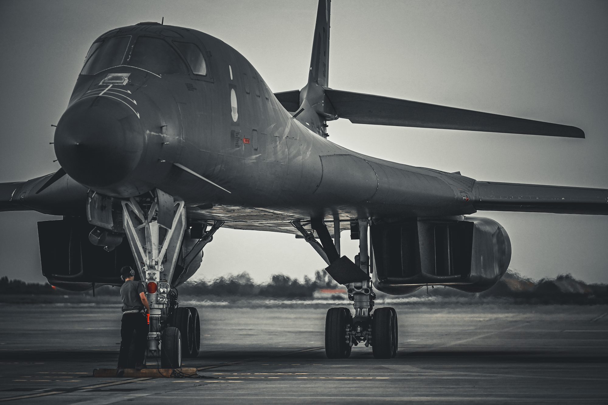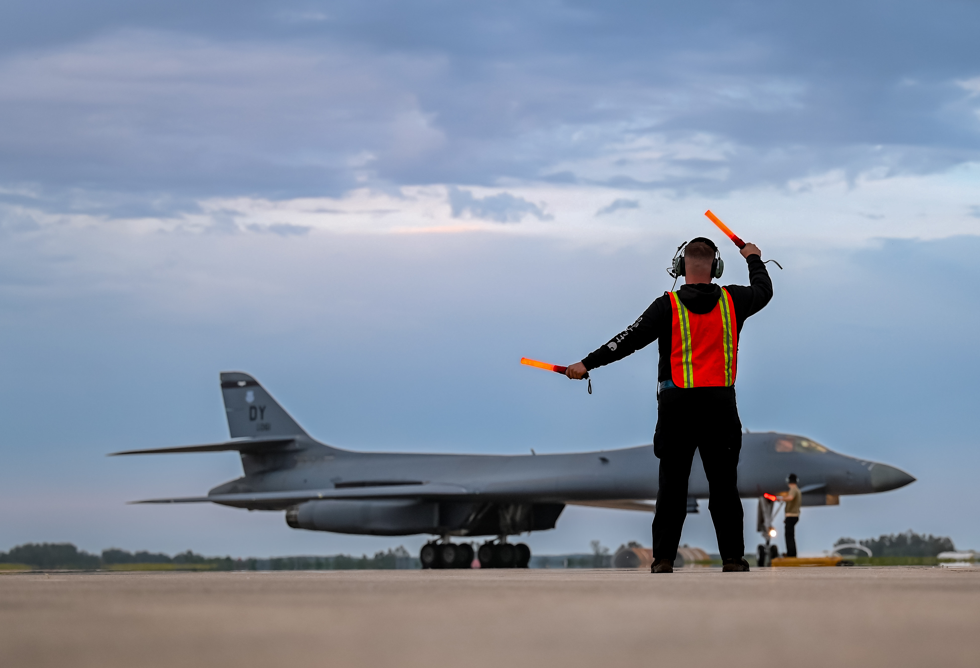 Senior Airman Luke Beauchemin, 9th Expeditionary Bomb Squadron crew chief, marshals in a B-1B Lancer assigned to Dyess Air Force Base, Texas, at Morón Air Base, Spain, during Bomber Task Force Europe April 19, 2024. Airmen from the 9th EBS along with two B-1B Lancers completed a trilateral integration with the Ghanaian Air Force and Army, and both United Kingdom and U.S. special forces in support of exercise Flintlock and BTF Europe. (U.S. Air Force photo by Staff Sgt. Holly Cook)