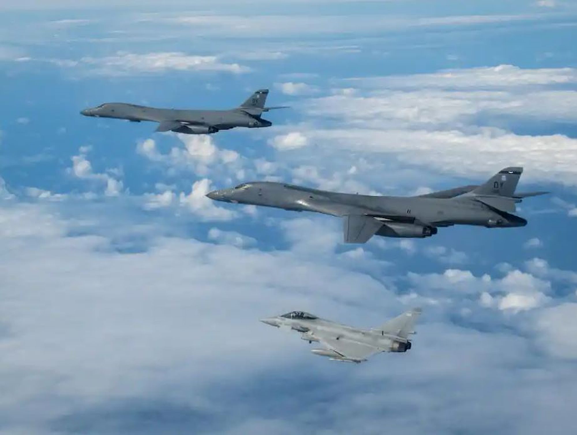 B-1B Lancers with the 9th Expeditionary Bomb Squadron from Dyess Air Force Base, Texas, inflight with a British Typhoon fighter jet in support of Bomber Task Force Europe, April 21, 2024. BTF operations are U.S. Strategic Command's means of conducting Dynamic Force Employment in support of the Department of Defense's National Defense Strategy at the direction of the President of the United States.