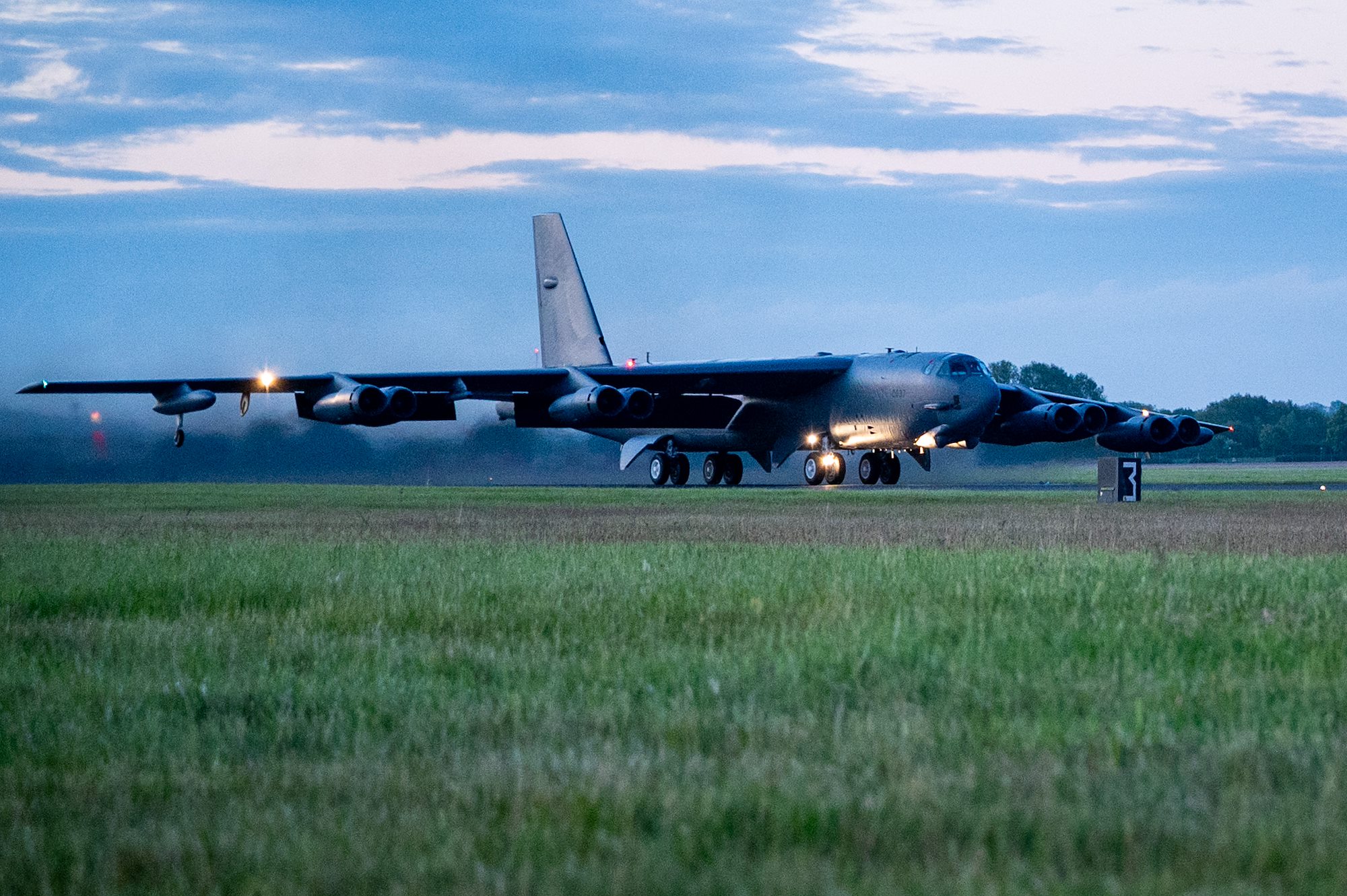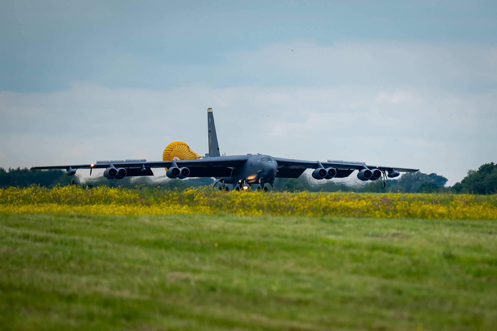 A U.S. Air Force B-52H Stratofortress, assigned to the 69th Expeditionary Bomb Squadron deploys a parachute at Royal Air Force Base Fairford, England May 29, 2024. U.S. participation in NATO-led training missions ensures preparedness and reinforces collective defense commitment. (U.S. Air Force photo by Airman 1st Class Jared Brewer)