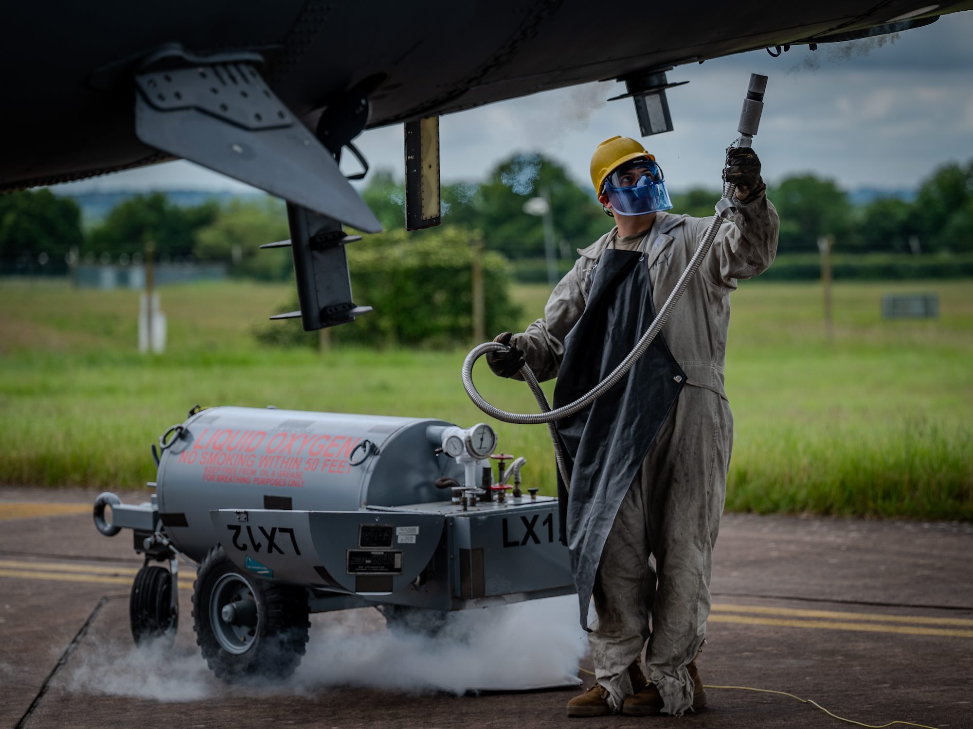 U.S. Air Force Airman 1st Class Robert Dodd, assigned to the 5th Aircraft Maintenance Squadron performs liquid oxygen maintenance at Royal Air Force Base Fairford, England June 3, 2024. Strategic bomber missions enhance the readiness and training necessary to respond to any potential crisis or challenge across the globe. (U.S. Air Force photo by Airman 1st Class Jared Brewer)
