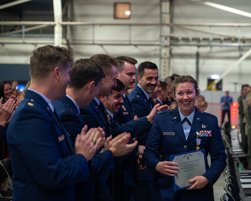 Other aircrew recognized during the ceremony received Distinguished Flying Crosses for their commitment to their mission, flying their F-15Es through a complex and dangerous airspace filled with engagements by active air defense systems and falling debris multiple times that night.