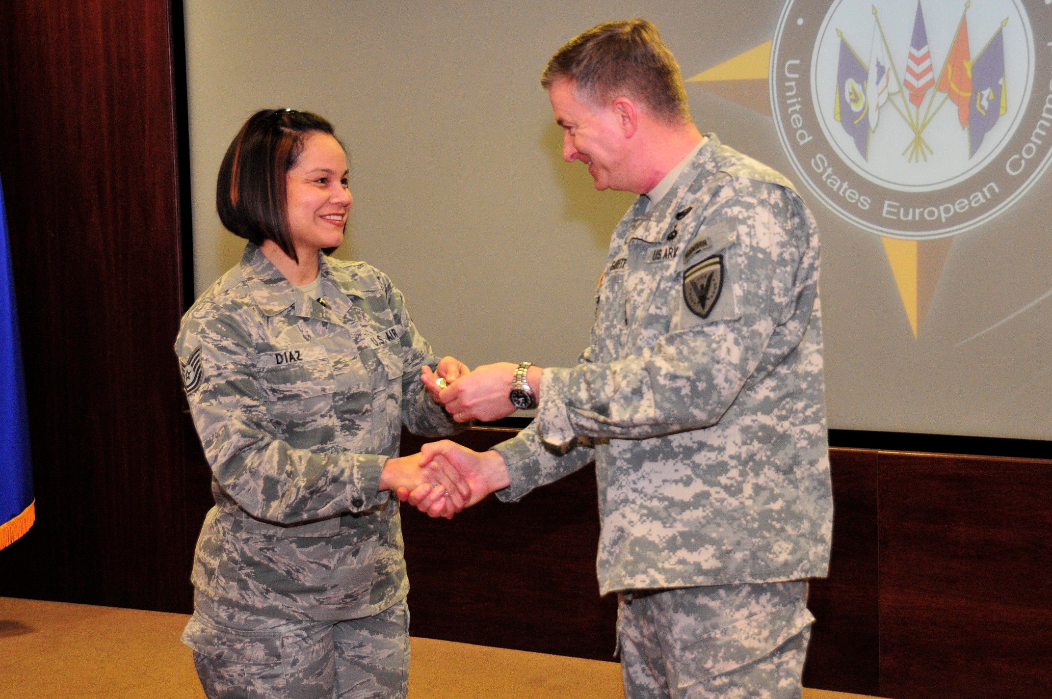 U.S. European Command Deputy Commander Lt. Gen. William Garrett III presents a coin to Technical Sgt. Sol Diaz, NCOIC Senior Leader Management Office, for outstanding performance.