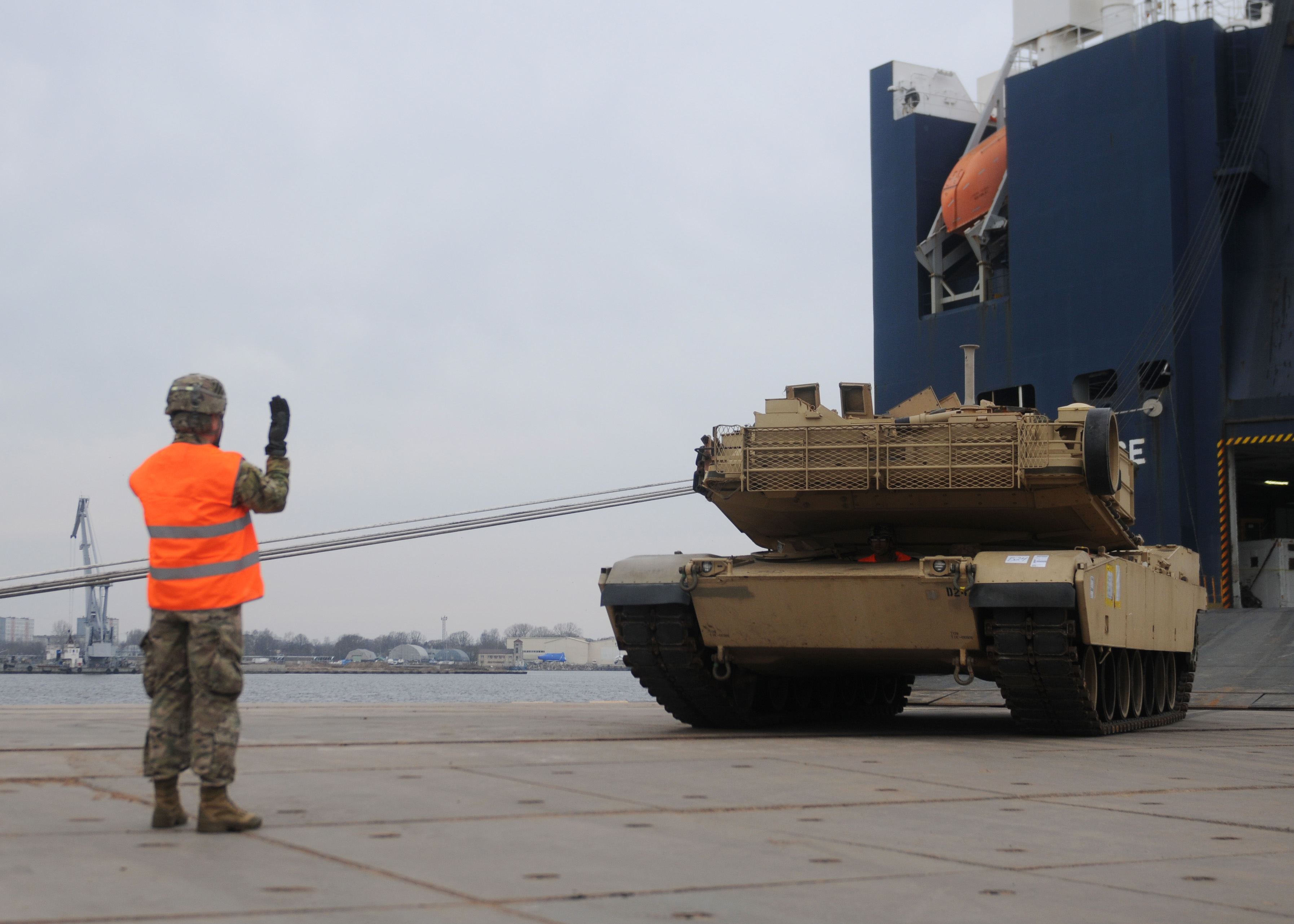 RIGA, Latvia – Soldiers from the 3rd Infantry Division offload an M1A2 Abrams Main Battle Tank from the transportation vessel “Liberty Promise” March 9 at the Riga Universal Terminal docks. More than 100 pieces of equipment, including the tanks, M2A3 Bradley Fighting Vehicles and assorted military cargo, will move on to sites in other areas of Latvia as well as Estonia and Lithuania in support of Operation Atlantic Resolve.