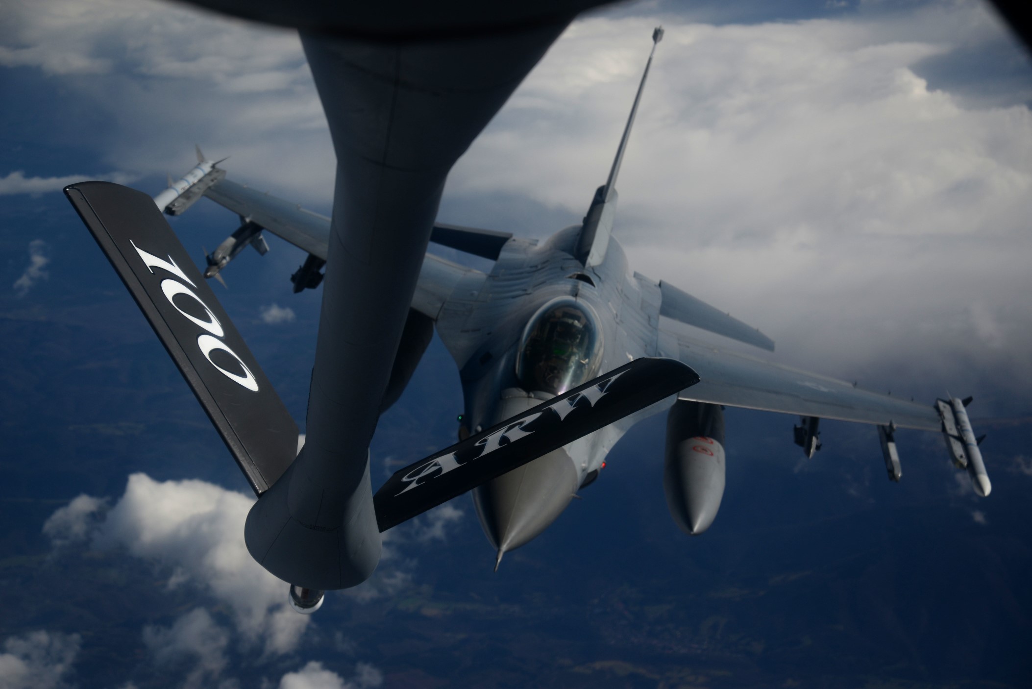 An F-16 Fighting Falcon from the 31st Fighter Wing, Aviano Air Base, Italy, approaches for air refueling from a KC-135 Stratotanker from the 100th Air Refueling Wing, RAF Mildenhall, England, March 4, 2015, during Exercise Iron Hand over southern France. Through forward presence and ready forces, U.S. Air Forces in Europe – Air Forces Africa executes missions in support of regional and global operations to provide global vigilance, global reach and global power for national objectives across an area spanning 104 countries. (U.S. Air Force photo by Senior Airman Kate Maurer/Released)