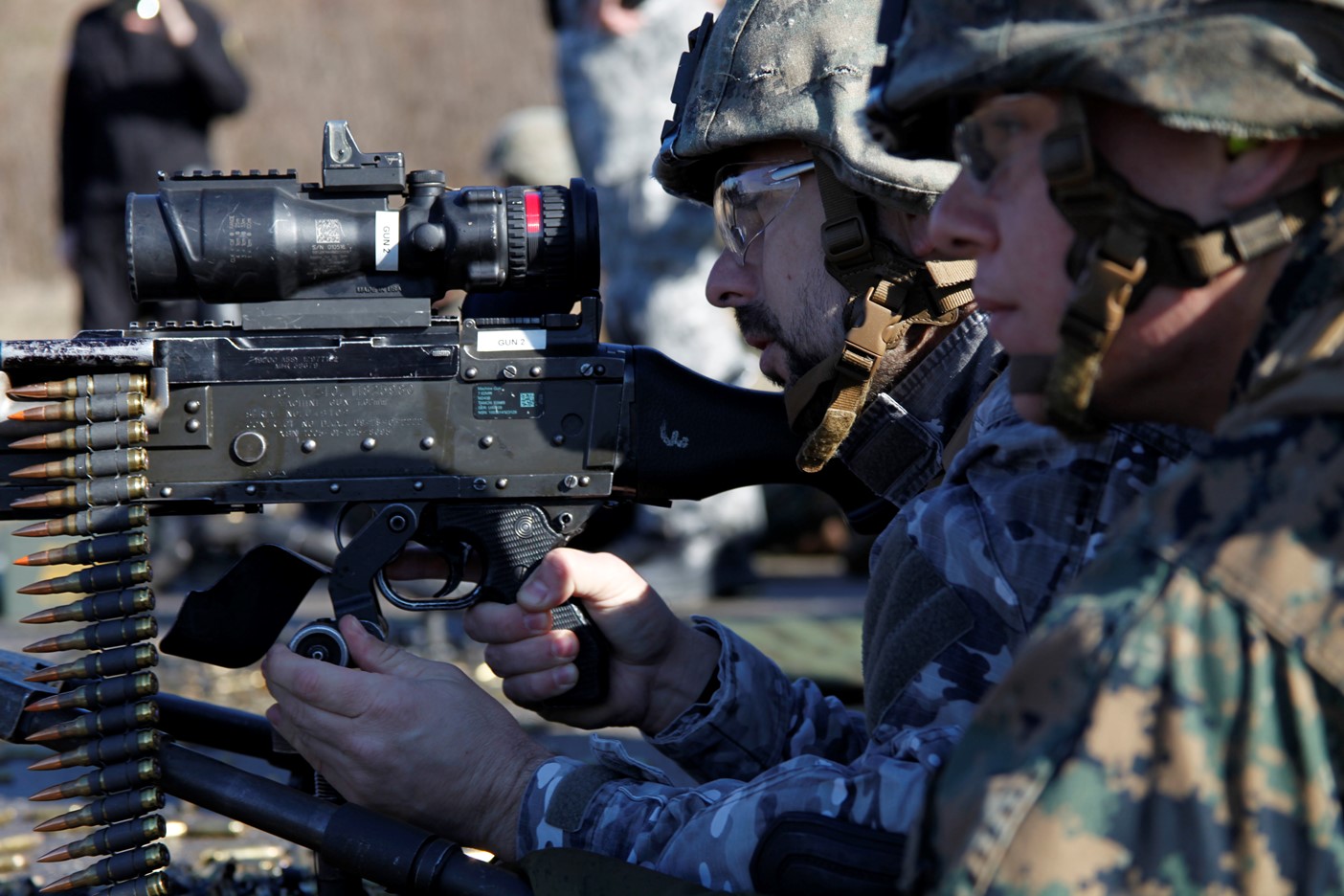 U.S. Marine Lance Cpl. Joseph Zullo from Alpha Fleet Anti-terrorism Security Team Company Europe (FASTEUR), Naval Station Rota, instructs a Romanian Jandarmeria member in the use of an M240B machine gun at the Romanian intelligence service shooting range in Bucharest, Romania, Feb. 26, 2015. FASTEUR Marines conducted small arms marksmanship training with host nation forces during an embassy engagement to familiarize both forces on weapons normally used during security operations. (U.S. Marine Corps photo by Sgt. Esdras Ruano/Released)