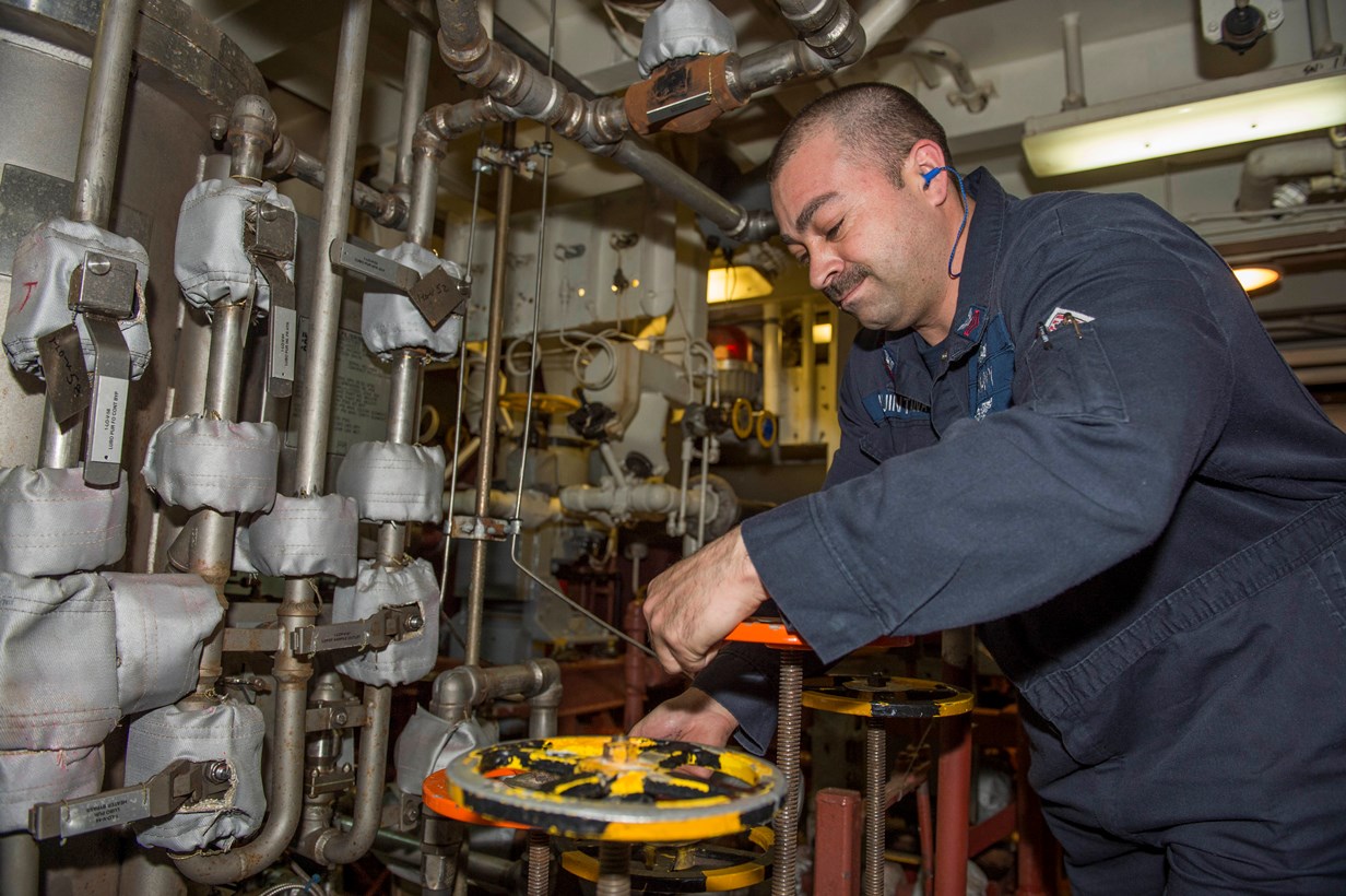 Damage Controlman 1st Class Brian Quintana from Silver City, N.M., aligns the lube oil filter/separation purifier in a main engine space aboard USS Laboon (DDG 58) March 24, 2015. Laboon, an Arleigh Burke-class guided-missile destroyer, homeported in Norfolk, is conducting naval operations in the U.S. 6th Fleet area of operations in support of U.S. national security interests in Europe. (U.S. Navy photo by Mass Communication Specialist 3rd Class Desmond Parks)