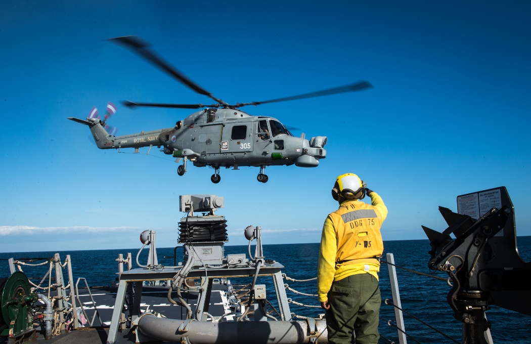 USS Donald Cook (DDG 75) conducts flight quarters with a United Kingdom Royal Navy Lynx Helicopter, March 25, 2015. Donald Cook, an Arleigh Burke-class guided-missile destroyer forward-deployed to Rota, Spain, is conducting naval operations in the U.S. 6th Fleet area of operations in support of U.S. national security interests in Europe. (U.S. Navy photo by Mass Communication Specialist 2nd Class Karolina A. Oseguera/Released)