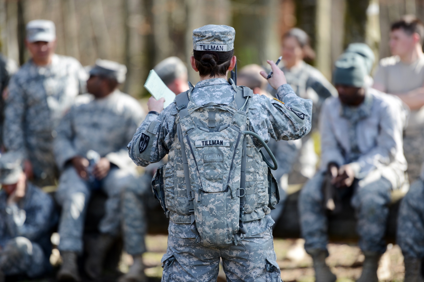 U.S. Soldiers assigned to 554th Military Police Company discuss the training evolution they completed as part of a 96-hour Field Training Exercise (FTX) called Operation Mandalorian. The exercise consisted of various scenarios including simulated terrorist attacks and medical response procedures and was conducted in the Local Training Area, Boeblingen, Germany, from March 23 to March 26, 2015. (U.S. Army photo by Visual Information Specialist Jason Johnston/Released)