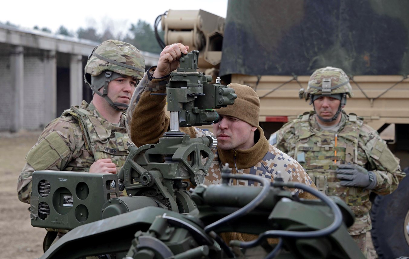 Sgt. David Snyder, gunner assigned to Bravo Battery, 1st Battalion, 119th Field Artillery Regiment, Michigan National Guard, watches Pfc. Jevgenijs Gubinskis, Latvian Land Forces, change the gunner's site controls on their M777A2 howitzer during training near Adazi, Latvia, March 24, 2015. The Michigan National Guard 1-119th FA is working with their Latvian counterparts as part of Operation Summer Shield XII, a multinational NATO training exercise whose participants include U.S. active duty Army, Reserve, and National Guard, U.S. Marines, and units from Latvia, Lithuania, Germany, Luxembourg, and Canada. Michigan and Latvia have worked together in the State Partnership Program for 23 years. (U.S. Army photo by Staff Sgt. Kimberly Bratic, Michigan National Guard/Released)