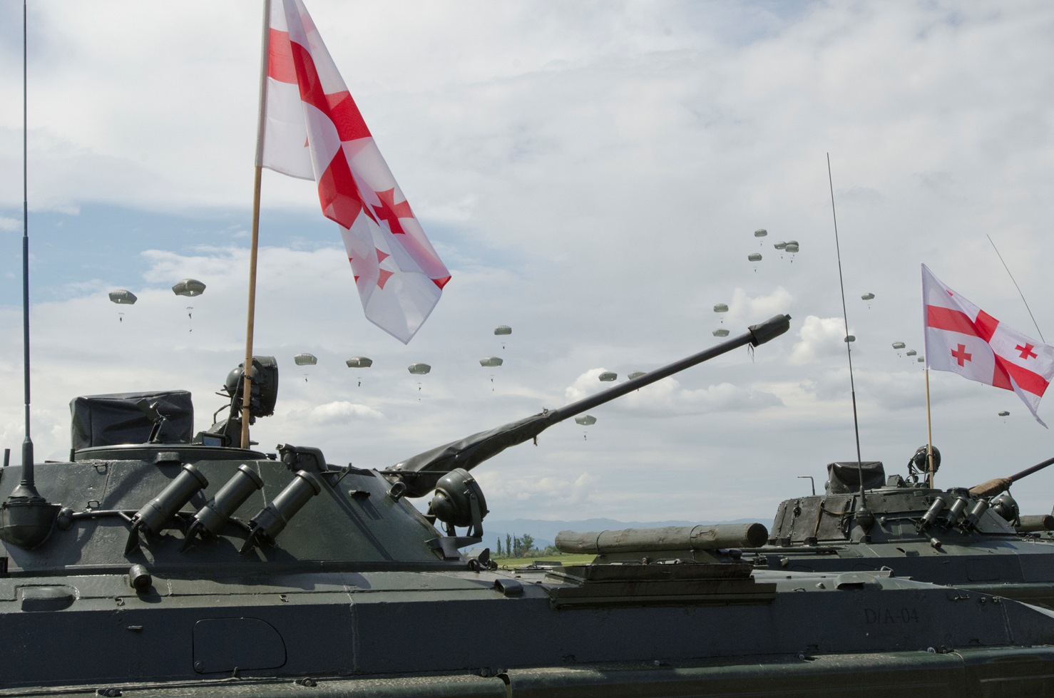 Paratroopers from the 173rd Airborne Brigade parachute into the opening ceremony of Exercise Noble Partner here May 10, 2015. Noble Partner is a U.S. Army Europe-Georgia exercise in support of Georgia's contribution to the NATO Response Force.