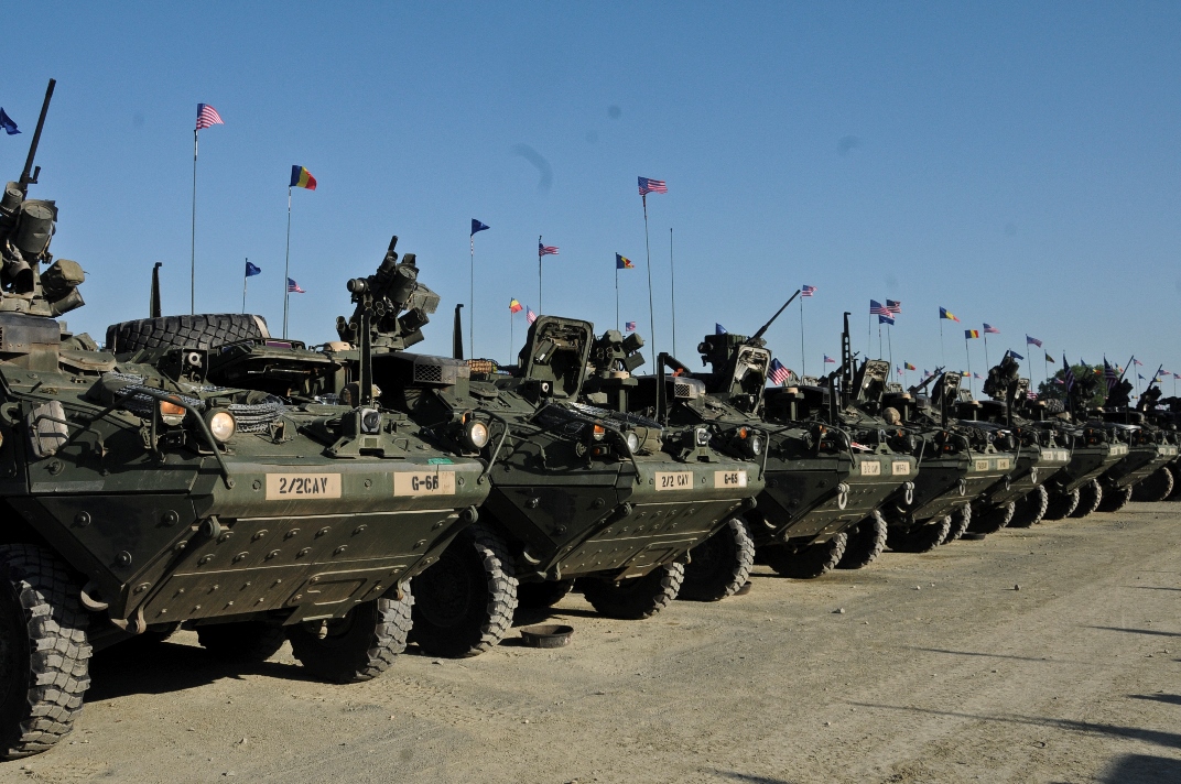 Troopers assigned to 2nd Squadron, 2nd Cavalry Regiment, place American, Romanian and NATO flags on their Stryker Combat Vehicles in preparation for the unit's Cavalry March to the Cincu Training Center, at Mihail Kogalniceanu Air Base, Romania, May 13, 2015. This event will not only focus on transporting troopers and their equipment to a new Romanian training facility, but it will also give the unit a chance to interact with the local populace while improving on relations with their host nation in support of Operation Atlantic Resolve-South. (U.S. Army photo by Sgt. William A. Tanner/released)