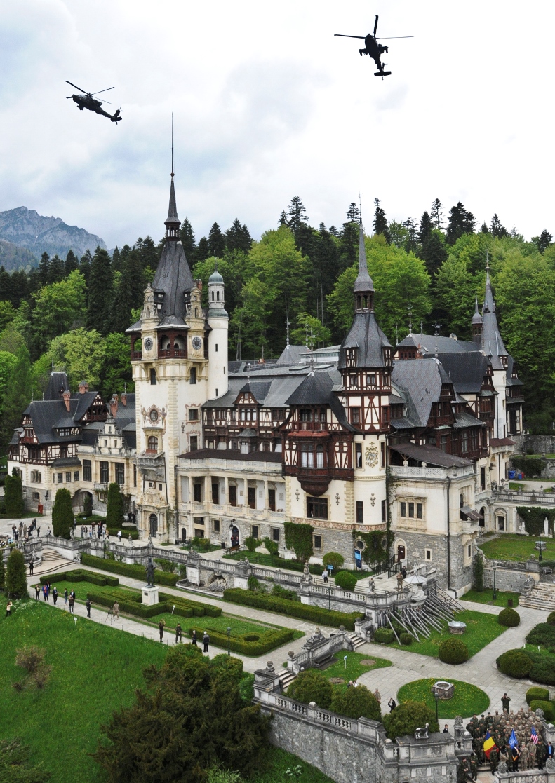 Two AH-64 Apache helicopters belonging to the 4-3 Assault Helicopter Battalion, which directly supports 2nd Squadron, 2nd Cavalry Regiment, hover above Peles Castle, while participating in a welcoming ceremony held by the mayor of the city for 2nd Squadron, during the unit's Cavalry March from Mihail Kogalniceanu Air Base to the Cincu Training Center, Romania, May 14, 2015. This event will not only focus on transporting troopers and their equipment to a new Romanian training facility, but it will also give the unit a chance to interact with the local populace while improving on relations with their host nation in support of Operation Atlantic Resolve-South. (U.S. Army photo by Sgt. William A. Tanner/released)