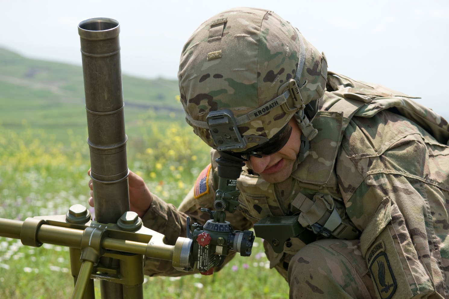 Spc. Ryan Krobath, a mortarman assigned to Troop C, 1st Squadron, 91st Cavalry Regiment, 173rd Abn. Bde., sets up a mortar system, making sight adjustments before the team began unpacking the mortar rounds May 20, 2015. The Soldiers trained at Vaziani Training Area, Georgia, during Exercise Noble Partner a field training and live-fire exercise between the U.S. Army and the Georgian military to support Georgia's participation in the NATO Response Force and build military ties between the two nations. (U.S. Army Photo by Sgt. Daniel Cole, Army Europe Public Affairs)