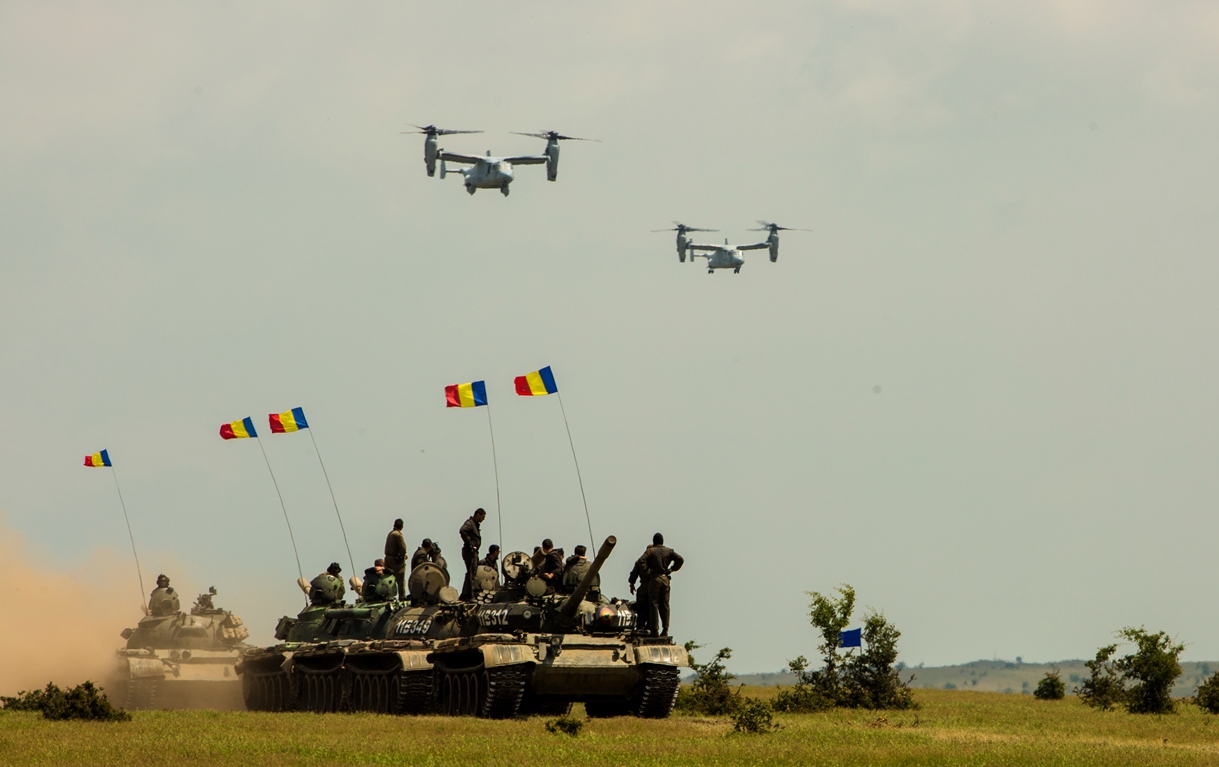 U.S. Marine MV-22B Ospreys from Special-Purpose Marine Air-Ground Task Force Crisis Response-Africa departed Mihail Kogălniceanu Air Base, Romania, with a platoon of Marines from the Black Sea Rotational Force to support a multilateral training exercise during Platinum Eagle 15, May 26, 2015. The Ospreys left Morón Air Base, Spain, earlier in the week, and arrived to work with their allies from the Bulgarian and Romanian armed forces. The Ospreys delivered the Marines to the Babadag Training Area, where they demonstrated their ability to conduct security operations. The training represents the first time Ospreys have conducted multilateral training in Romania, where members of BSRF have established a growing relationship with partner Romanian forces. (U.S. Marine Corps photo by Sgt. Paul Peterson/Released)