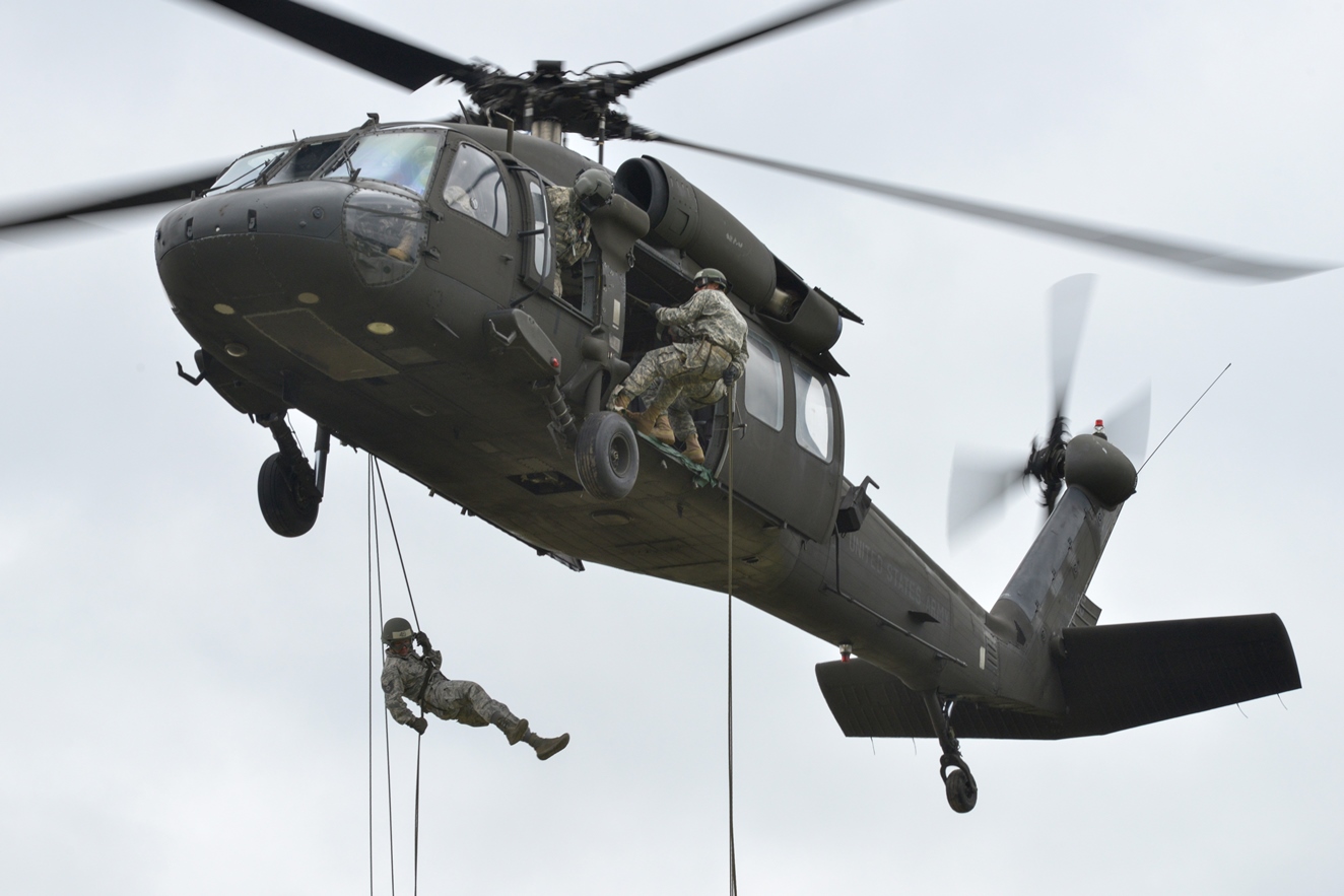 U.S. Soldiers and Airmen, assigned to various units throughout Europe, rappel from a UH-60 Black Hawk during an air assault course at the 7th Army Joint Multinational Training Command's Grafenwoehr Training Area, Germany, June 9, 2015. The course is being conducted through the 7th Army Combined Arms Training Center by a mobile training team from Ft. Bragg and marks the first time the Air Assault Course has been held at the newly-built and renovated air assault facilities of the Grafenwoehr Training Area. (U.S. Army photo by Visual Information Specialist Markus Rauchenberger/released)