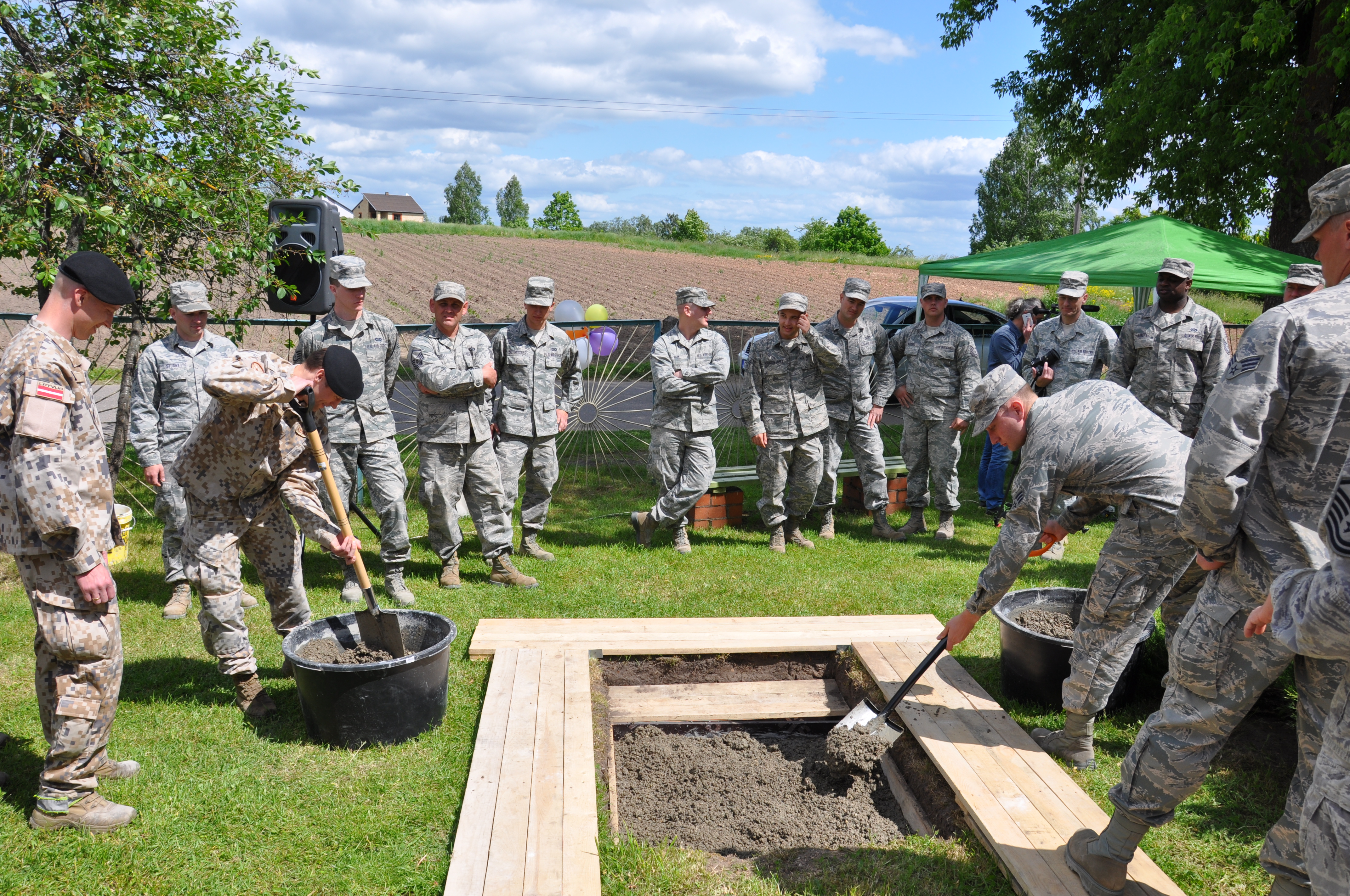 MAJ Girts Savins (Latvian National Armed Forces); Ms. Vanda Kezika (Daugavpils Regional Council), Ms. Lilita Gasjaņeca (Naujene Orphanage), Ms. Vanessa Acker (U.S. Embassy), MAJ Noah Diehl (190th CES, KS ANG) are placing a time capsule to commemorate the start of the renovation project at Naujene Orphanage. Photo by Office of Defense Cooperation Latvia.