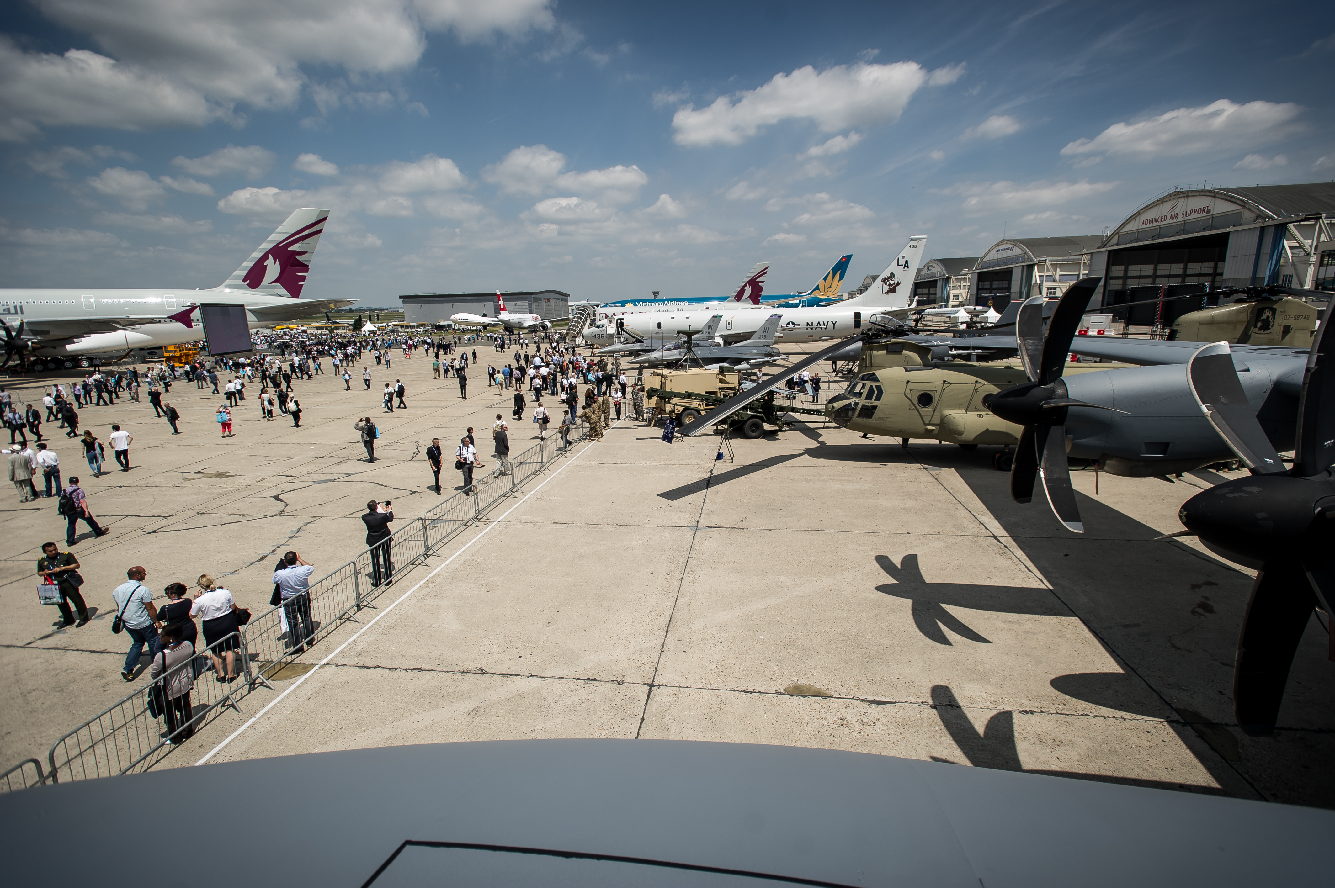 U.S. Army, Navy and Air Force aircraft are on display during the Paris Air Show at Le Bourget Airport, France, June 17, 2015. The Paris Air Show provides a collaborative opportunity to share and strengthen the U.S. and European strategic partnership that has been forged during the last seven decades and is built on a foundation of shared values, experiences and vision. The event is expected to bring in 315,000 people, a record 2,215 companies, 150 aircraft, and will span 324,000 square meters. (U.S. Air Force photo/ Tech. Sgt. Ryan Crane)