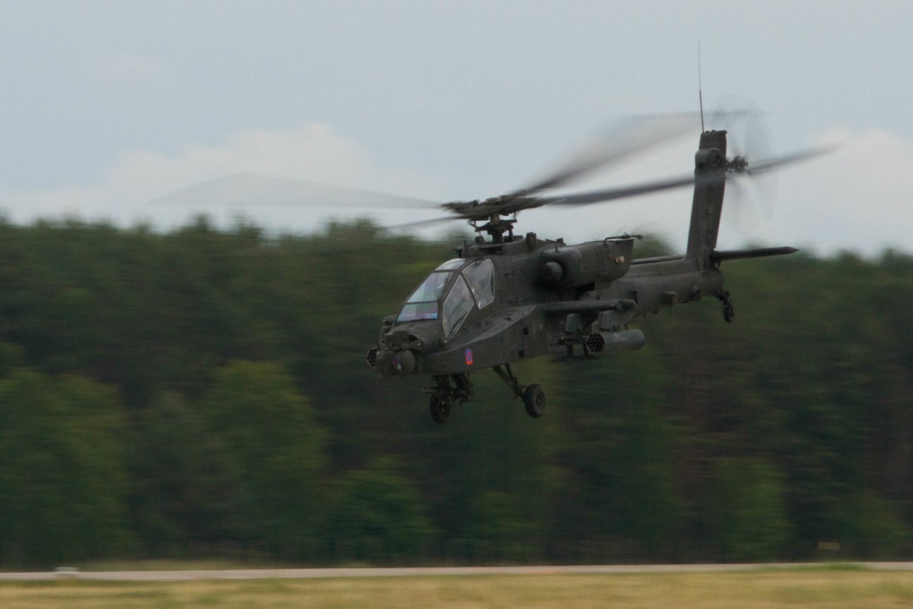 Soldiers with the 2nd Battalion, 159th Attack Reconnaissance Battalion, 12th Combat Aviation Brigade take off in a Boeing AH-64 Apache helicopter June 18, 2015, in Mirosławiec, Poland, during Saber Strike 15. Encompassing more than 6,000 participants from 13 different nations, Saber Strike is a long-standing U.S. Army Europe-led cooperative training exercise. Designed to improve joint operational capability in a range of missions as well as preparing the participating nations and units to support multinational contingency operations, this year's exercise takes place across Estonia, Latvia, Lithuania and Poland. (U.S. Army photo by Spc. Marcus Floyd, 13th Public Affairs Detachment)