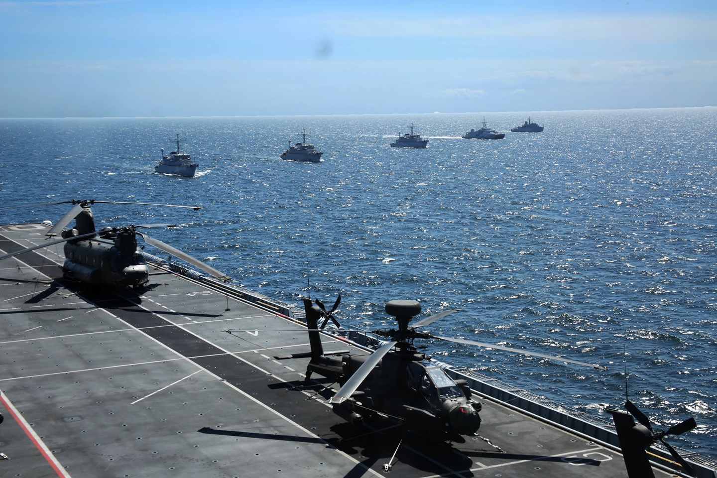 The United Kingdom’s Royal Navy’s flagship, the HMS Ocean, positioned herself alongside other ships during the photo exercise showcasing the amphibious assets for BALTOPS 2015, June 8, 2015. The exercise is an annually recurring multinational exercise designed to enhance flexibility and interoperability, as well as demonstrate resolve of allied and partner forces to defend the Baltic region (U.S. Marine Corps photo by 1st Lt. Sarah E. Burns)