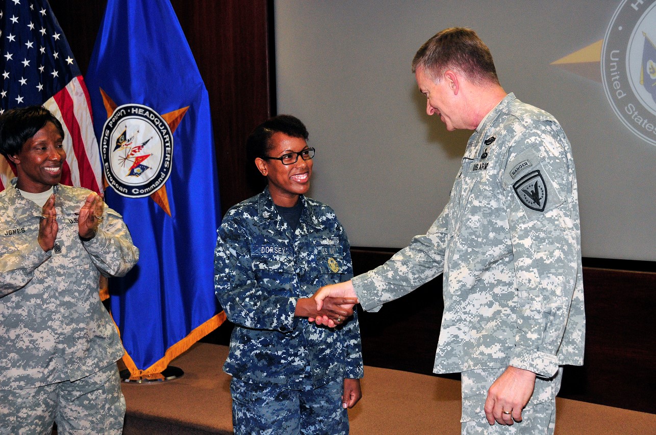 U.S. European Command Deputy Commander Lt. Gen. William Garrett III presents a coin to PO1 Prescilla Dorsey, Career Counselor for outstanding duty performance.