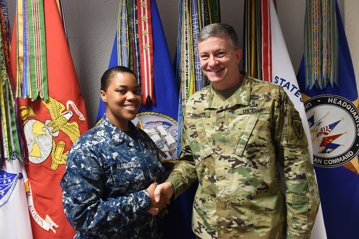 U.S. European Command Deputy Commander Lt. Gen. W. Burke Garrett III presents a coin to GM1 Jessica Alcantar, Armory NCOIC, for outstanding duty performance Apr. 15, 2016.