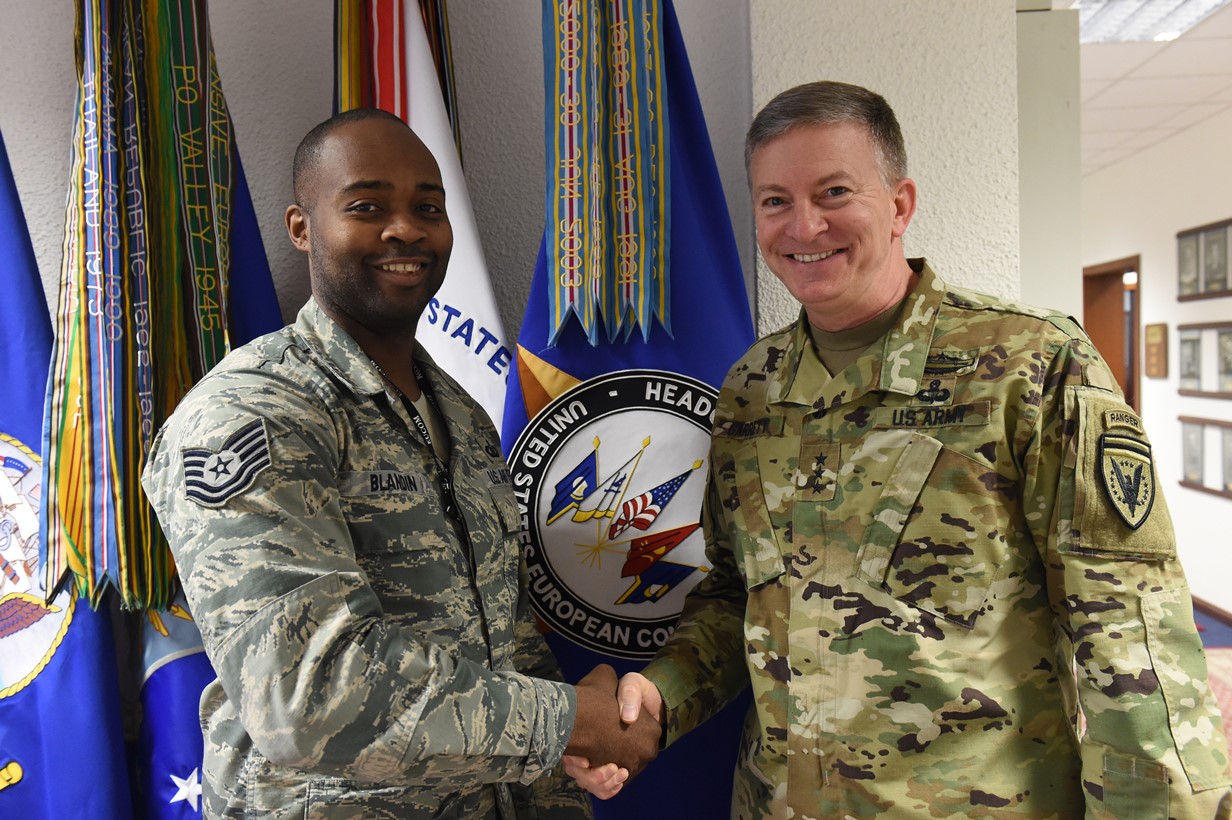 U.S. European Command Deputy Commander Lt. Gen. W. Burke Garrett III presents a coin to Tech. Sgt. Dwayne Blandin, Emergency Actions Controller, for outstanding duty performance Apr. 15, 2016.