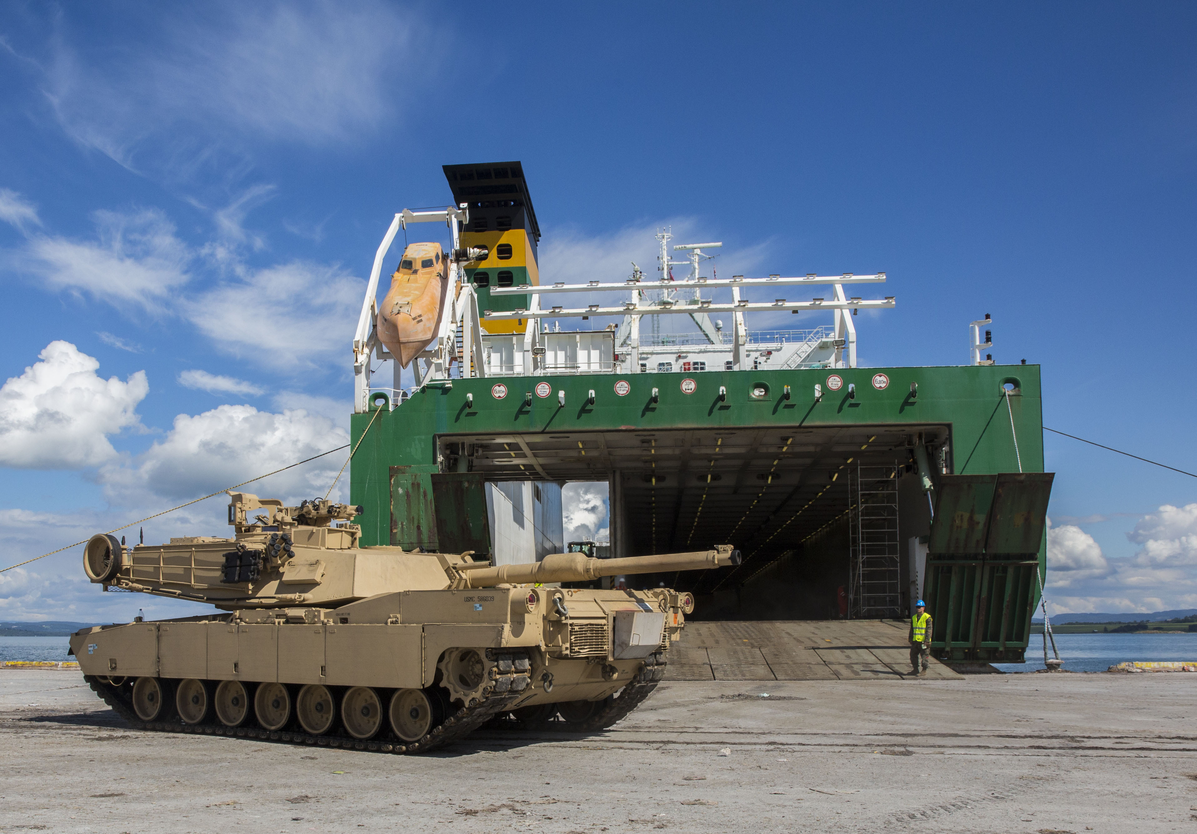 An M1 Abrams tank is staged at a Norwegian port following the conclusion of Exercise Saber Strike 16, July 4, 2016. The tank was used during Exercise Saber Strike 16, and was transported from Riga, Latvia, by a British Roll-On, Roll-Off ship. Once offloaded and staged, it was taken to a Marine Corps Prepositioning Program cave, where it will be meticulously maintained, ensuring it can be pulled and sent to the fight anywhere at any time. (U.S. Marine Corps photo by Sgt. Shawn Valosin/Released)