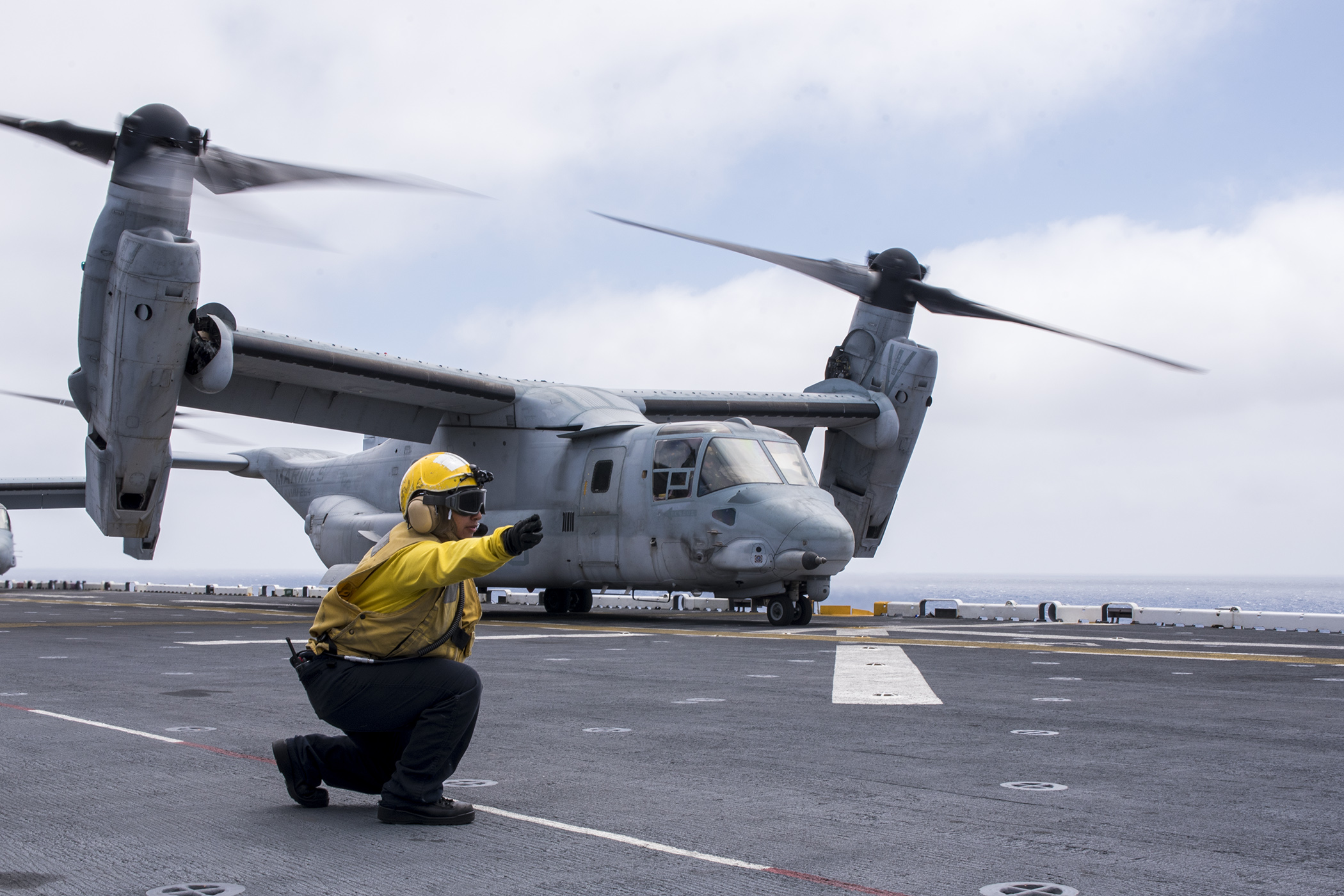 ATLANTIC OCEAN - Aviation Boatswain's Mate (Handling) 3rd Class Hilda Martinez signals an MV-22B Osprey for take off aboard the amphibious assault ship USS Wasp (LHD 1) July 9, 2016. Wasp is deployed with the Wasp Amphibious Ready Group to support maritime security operations and theater security cooperation efforts in the 6th Fleet area of operations. (U.S. Navy photo by Mass Communication Specialist 3rd Class Rawad Madanat)