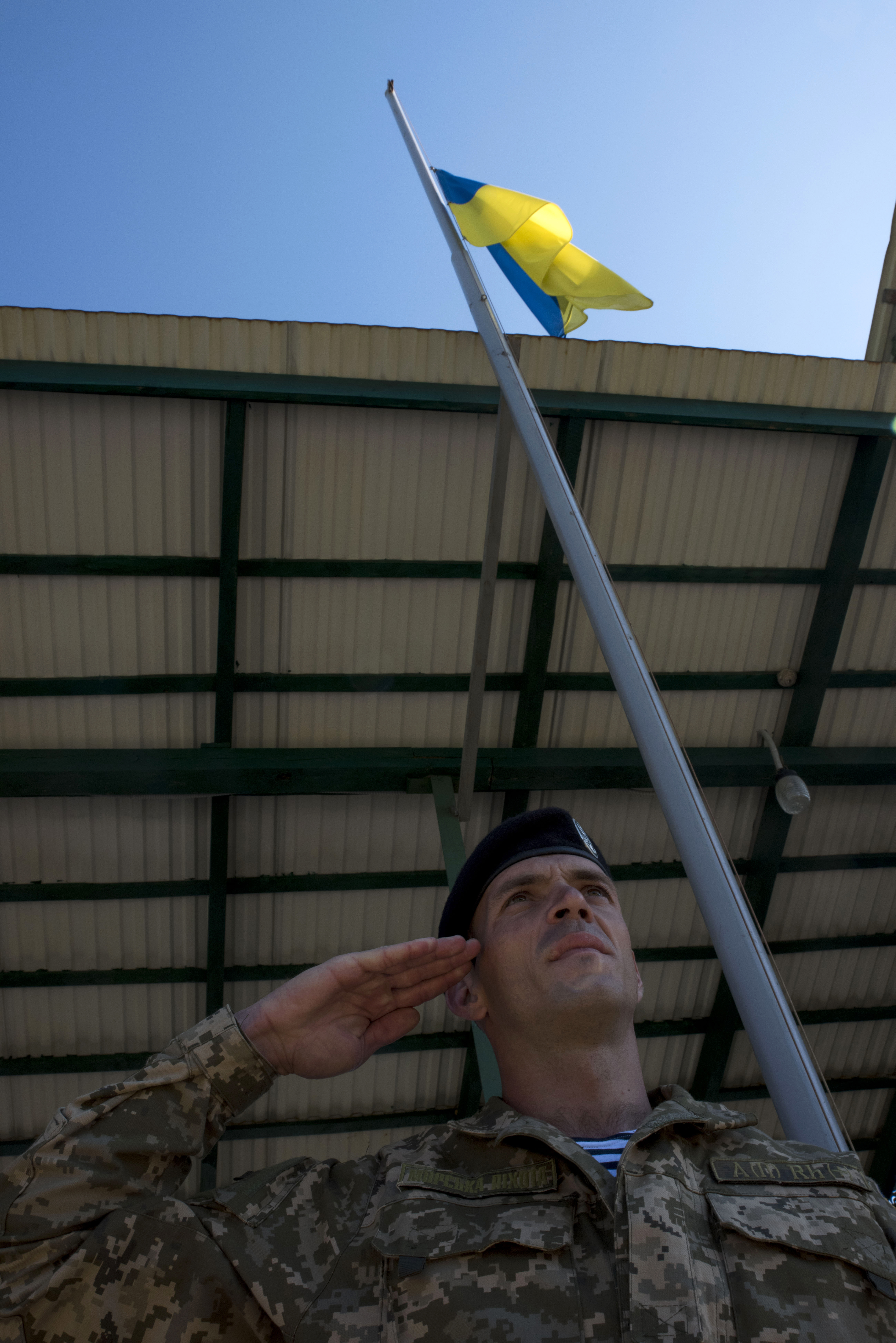 A Ukrainian soldier salutes as the Ukrainian flag is lowered during the closing ceremony for Exercise Rapid Trident 16 in Yavoriv, Ukraine July 8, 2016. The exercise is a regional command post and field training exercise that involves about 2,000 Soldiers from 13 different nations, being held at the International Peacekeeping and Security Center in Yavoriv, Ukraine June 27 - July 8, 2016. (U.S. Army photo by Sgt. 1st Class Whitney Hughes/Released)
